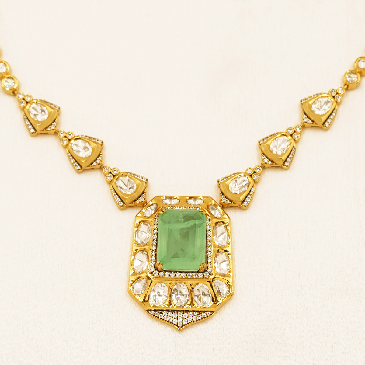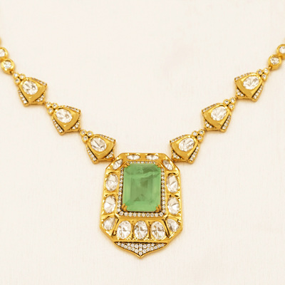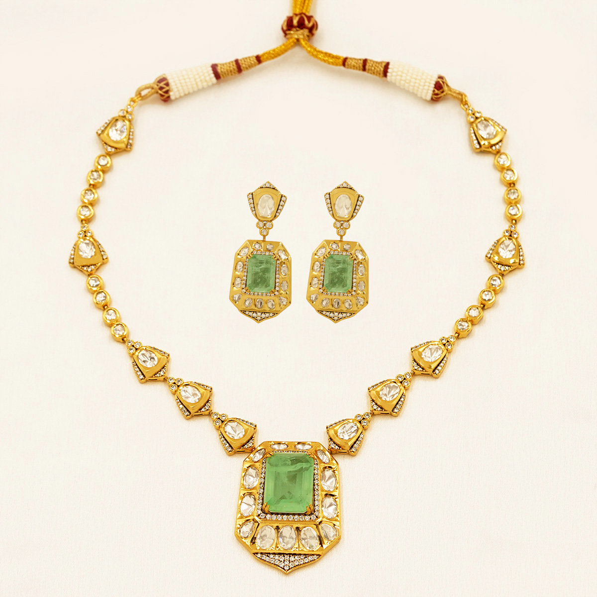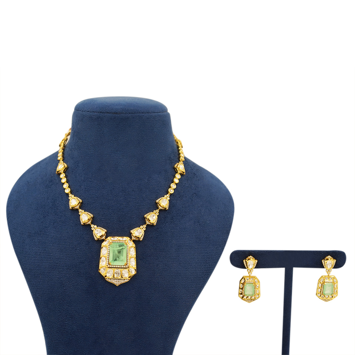 DESCRIPTION - An exquisite necklace set featuring a majestic green rectangular stone pendant surrounded by intricate Kundan work. The detailed craftsmanship, complemented by matching statement earrings, exudes regal elegance—perfect for weddings, festive occasions, and traditional celebrations.