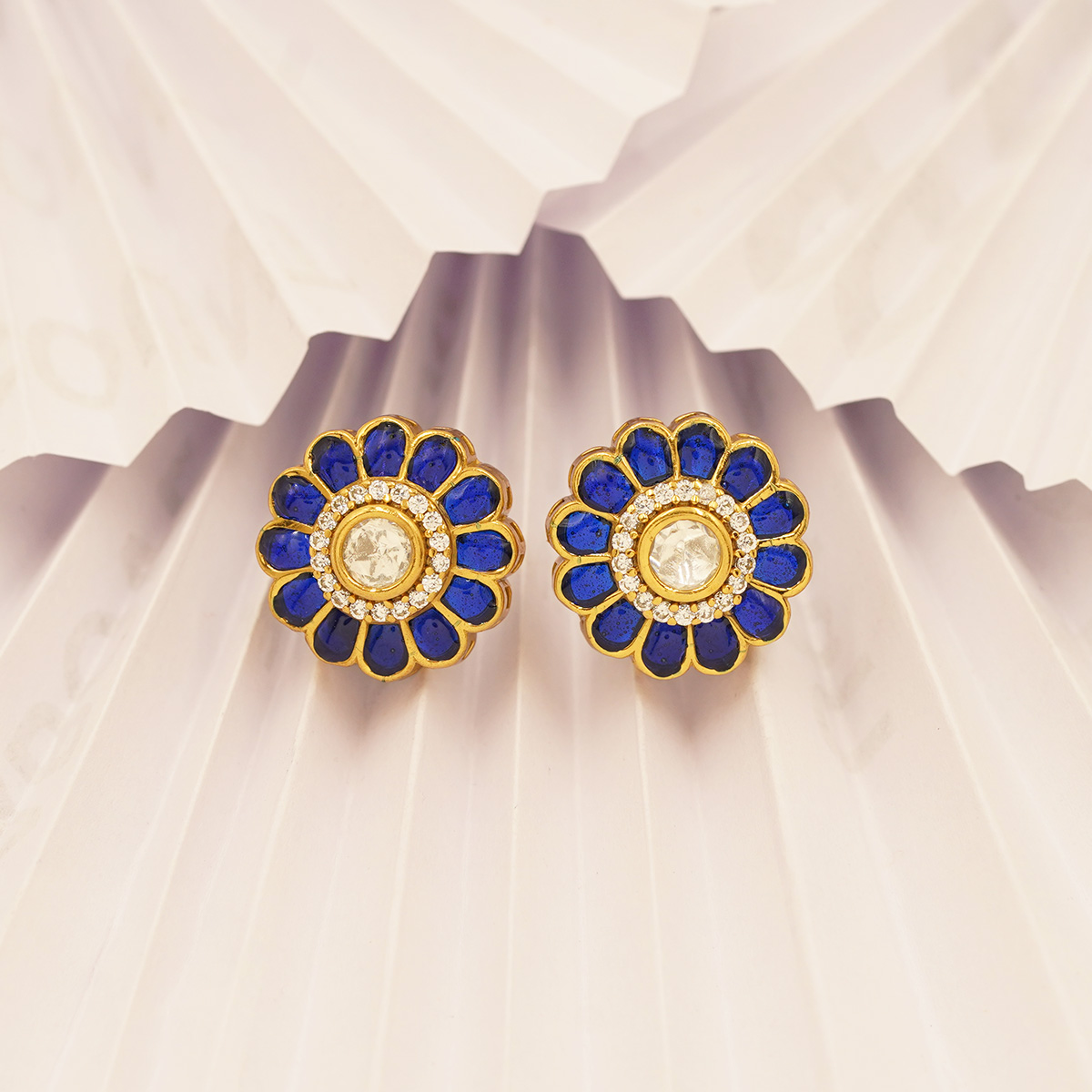 DESCRIPTION - THE ROYAL MIDNIGHT PETAL STUDS BLEND CLASSIC CHARM WITH LUXURIOUS DETAILING. DESIGNED IN A RADIANT FLORAL SHAPE, THESE STUDS FEATURE A GLEAMING GOLD-TONED CENTER SURROUNDED BY DEEP NAVY-BLUE PETAL STONES THAT CREATE A STUNNING CONTRAST. THE INTRICATE BEADWORK AROUND EACH PETAL ADDS RICHNESS, WHILE THE CIRCULAR DUAL-LAYER CENTER EVOKES TIMELESS ELEGANCE. PERFECT FOR WEDDINGS, FESTIVE WEAR, OR ELEVATING EVERYDAY OUTFITS, THESE EARRINGS BRING A REGAL YET GRACEFUL TOUCH TO ANY LOOK.