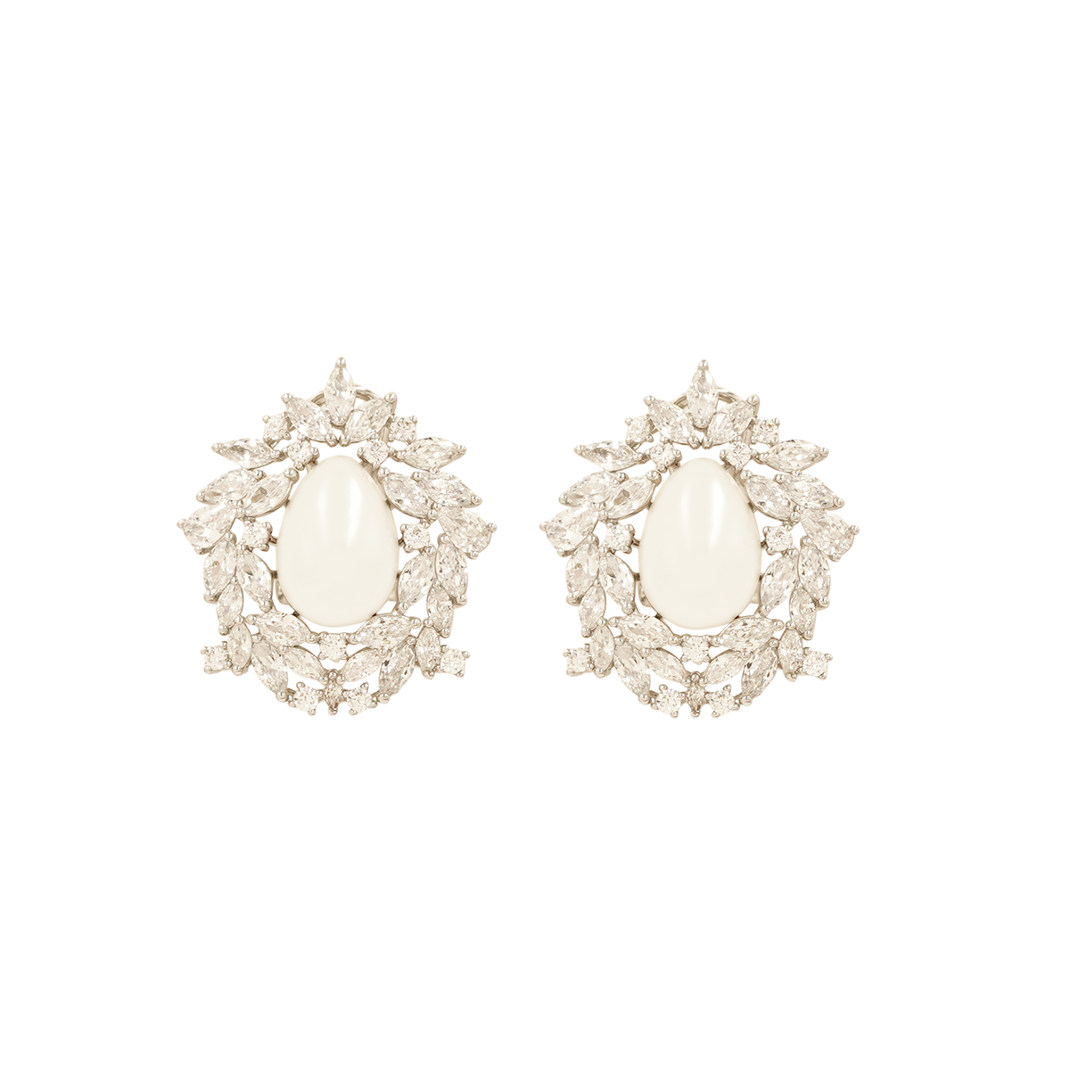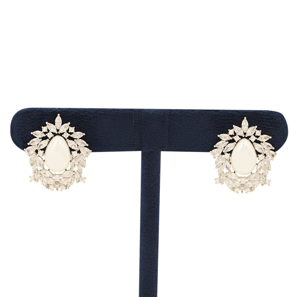 DESCRIPTION - These elegant pearl stud earrings feature a classic round pearl centerpiece surrounded by a sparkling floral halo design. Crafted in a luxurious gold-tone finish, they offer a timeless royal look perfect for weddings, festive occasions, and daily elegance. Lightweight and comfortable, these studs add a touch of grace and sophistication to any outfit, making them an ideal gift for women and girls who love classy jewelry.