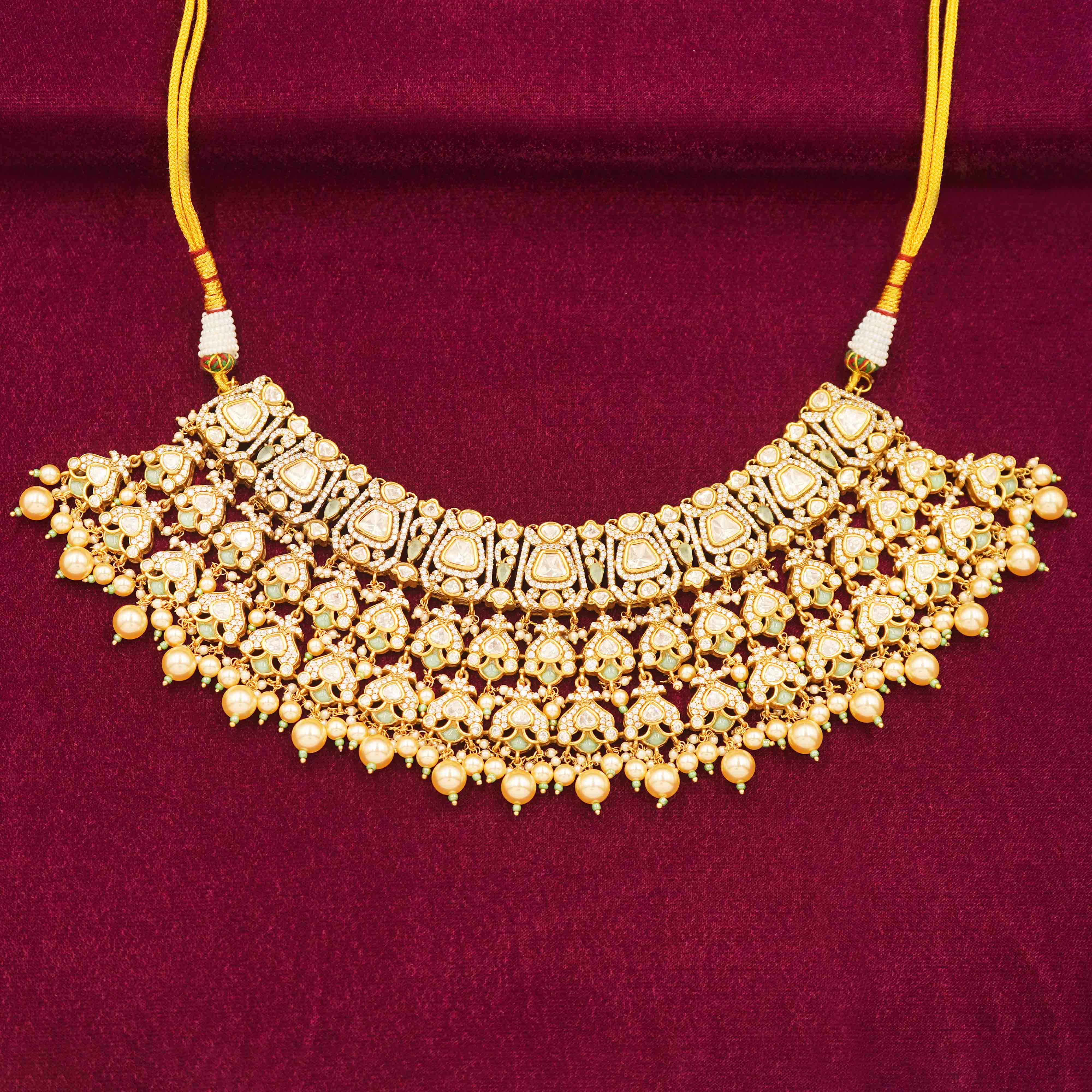 DESCRIPTION - Kundan Necklace Set / Choker Set / Heavy Kundan Bridal Choker Necklace Set Turn heads with this luxurious Kundan bridal choker necklace, exquisitely crafted with dazzling white stones, layered motifs, and elegant pearl drops. Set against a rich maroon backdrop, it reflects timeless Indian artistry with a majestic flair.