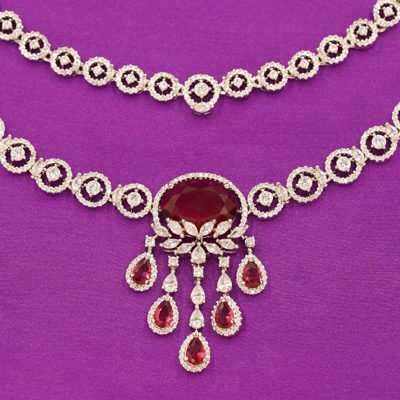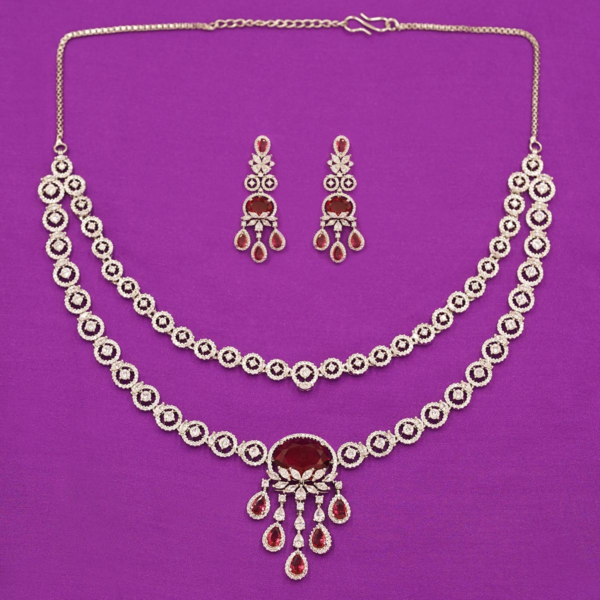 DESCRIPTION - Step into regal elegance with this Royal Ruby Charm Necklace Set, featuring a double-layer gold-tone chain adorned with radiant ruby-red stones and sparkling accents. perfect for weddings, festive occasions, or grand celebrations. Lightweight and non-metal, this set blends tradition with timeless beauty.