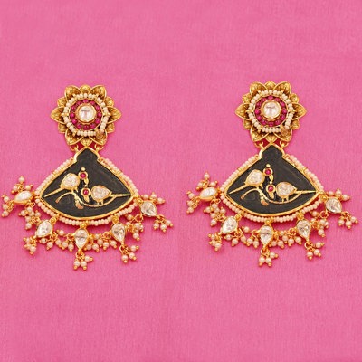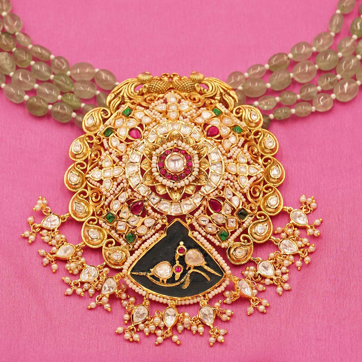 DESCRIPTION - The Smilona Royal Traditional Necklace Set – Designer Beaded & Stone Work Jewelry is a stunning piece that beautifully blends traditional Indian craftsmanship with royal elegance. Crafted on a brass metal base, this necklace features intricate detailing with Kundan stones, green and pink accent stones, designer beads, and clay embellishments, creating a rich and luxurious look. The fine micro-setting of each stone highlights the artistry and adds depth to the overall design. The necklace showcases elegant designer beadwork combined with classic Kundan embellishments, giving it a regal and timeless appeal. The set also includes matching earrings that perfectly complement the necklace and complete the overall statement look. Ideal for weddings, engagements, receptions, festive celebrations, and traditional occasions, this jewellery set pairs beautifully with sarees, lehengas, and other ethnic outfits. The Smilona Royal Traditional Necklace Set adds a touch of heritage luxury and graceful charm to any jewellery collection.