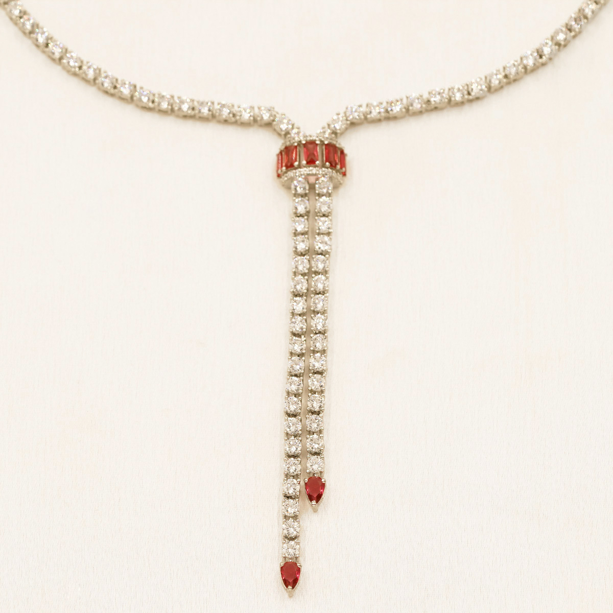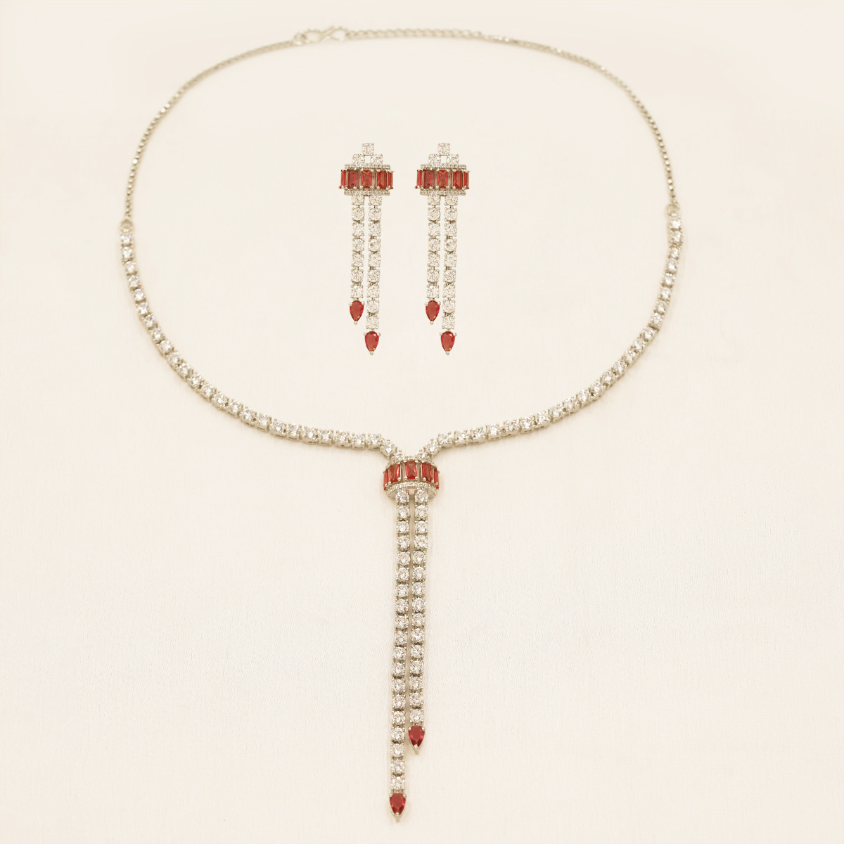 DESCRIPTION - A striking fusion of modern design and classic allure, this necklace set features cascading red highlights that flow gracefully along a shimmering chain. ideal choice for glamorous evenings, parties, or festive occasions where you want to leave a lasting impression.