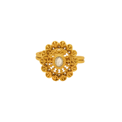 DESCRIPTION - TRADITIONAL INDIAN-STYLE COCKTAIL RING THAT IS TYPICALLY DESCRIBED AS A GOLD TONE-PLATED, ADJUSTABLE FINGER RING FEATURING INTRICATE FILIGREE WORK AND A CENTRAL WHITE STONE. DUE TO ITS ELABORATE AND OVERSIZED DESIGN, IT IS KNOWN AS A STATEMENT OR COCKTAIL RING, OFTEN WORN FOR FESTIVE OCCASIONS OR WEDDINGS.