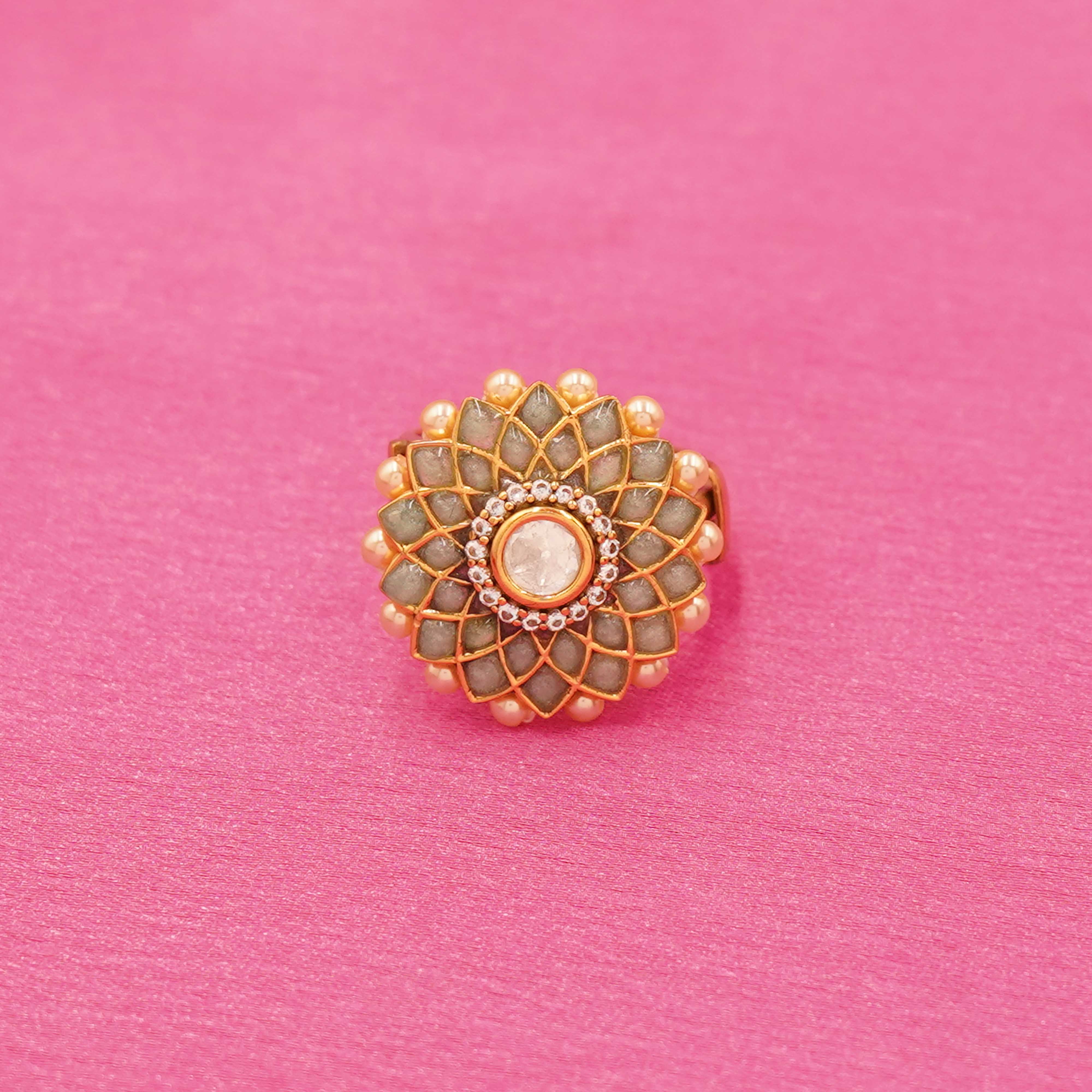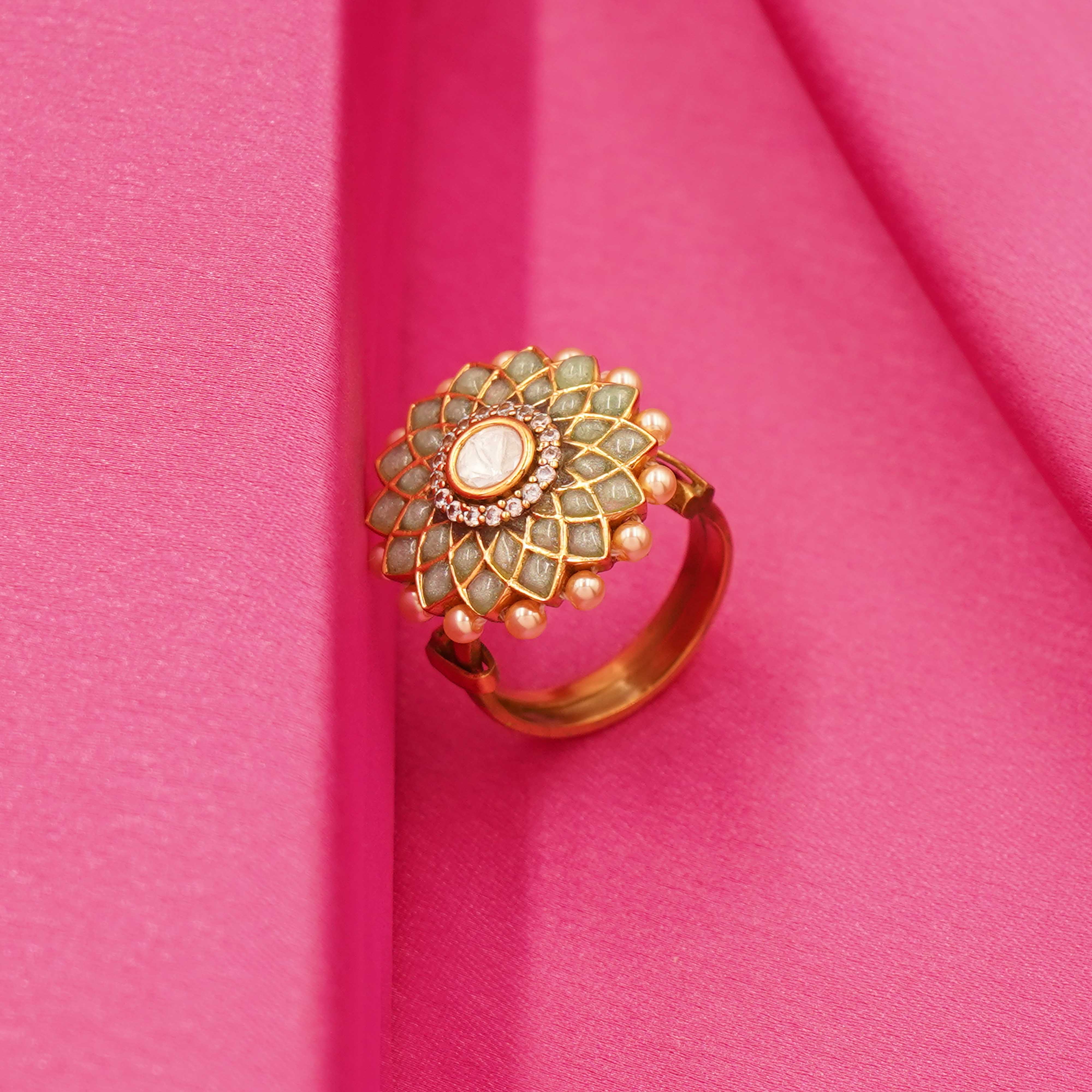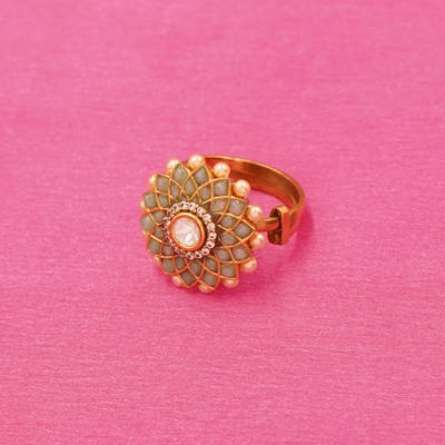 Zarina Panna Phool Ring – Smoke Mint Floral Elegance in Kundan Grace