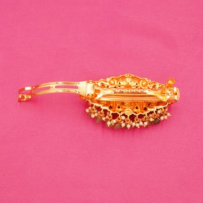 DESCRIPTION - HAIR CLIP/ HAIR BROOCH, A TRADITIONAL SOUTH INDIAN-STYLE TEMPLE JEWELLERY HAIR CLIP OR HAIR ACCESSORY, OFTEN REFERRED TO AS A "JADANAGAM" OR HAIR BROOCH. IT FEATURES INTRICATE TEMPLE-STYLE CRAFTSMANSHIP, LIKELY MADE FROM GOLD-PLATED METAL. IT INCLUDES EMBEDDED RUBIES OR RUBY-COLORED STONES AND EMERALD-LIKE GREEN BEADS WITH PEARLS HANGING BELOW, GIVING IT A REGAL AND FESTIVE APPEARANCE