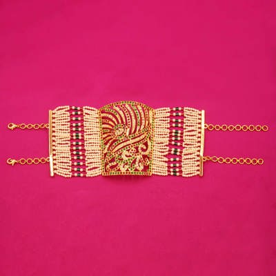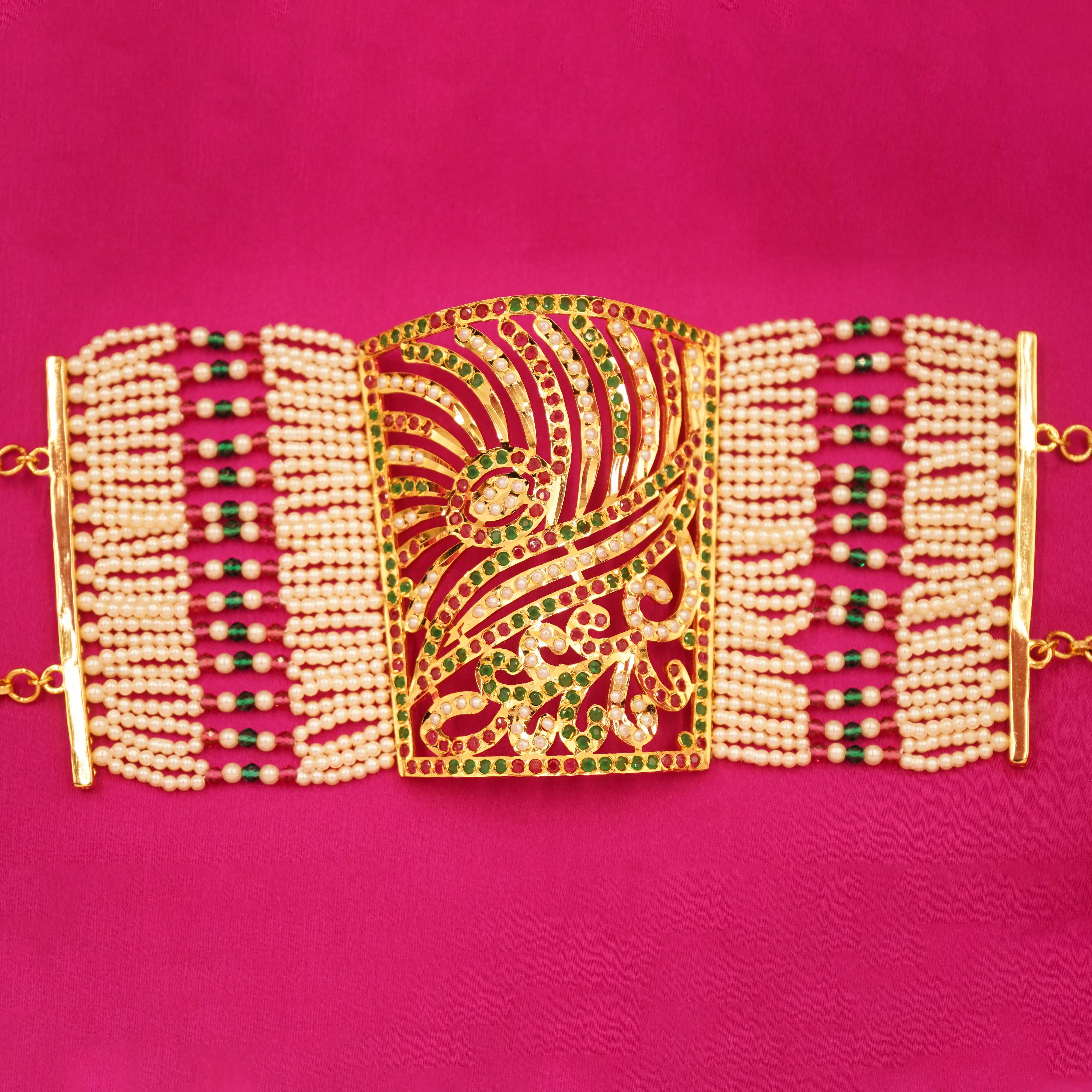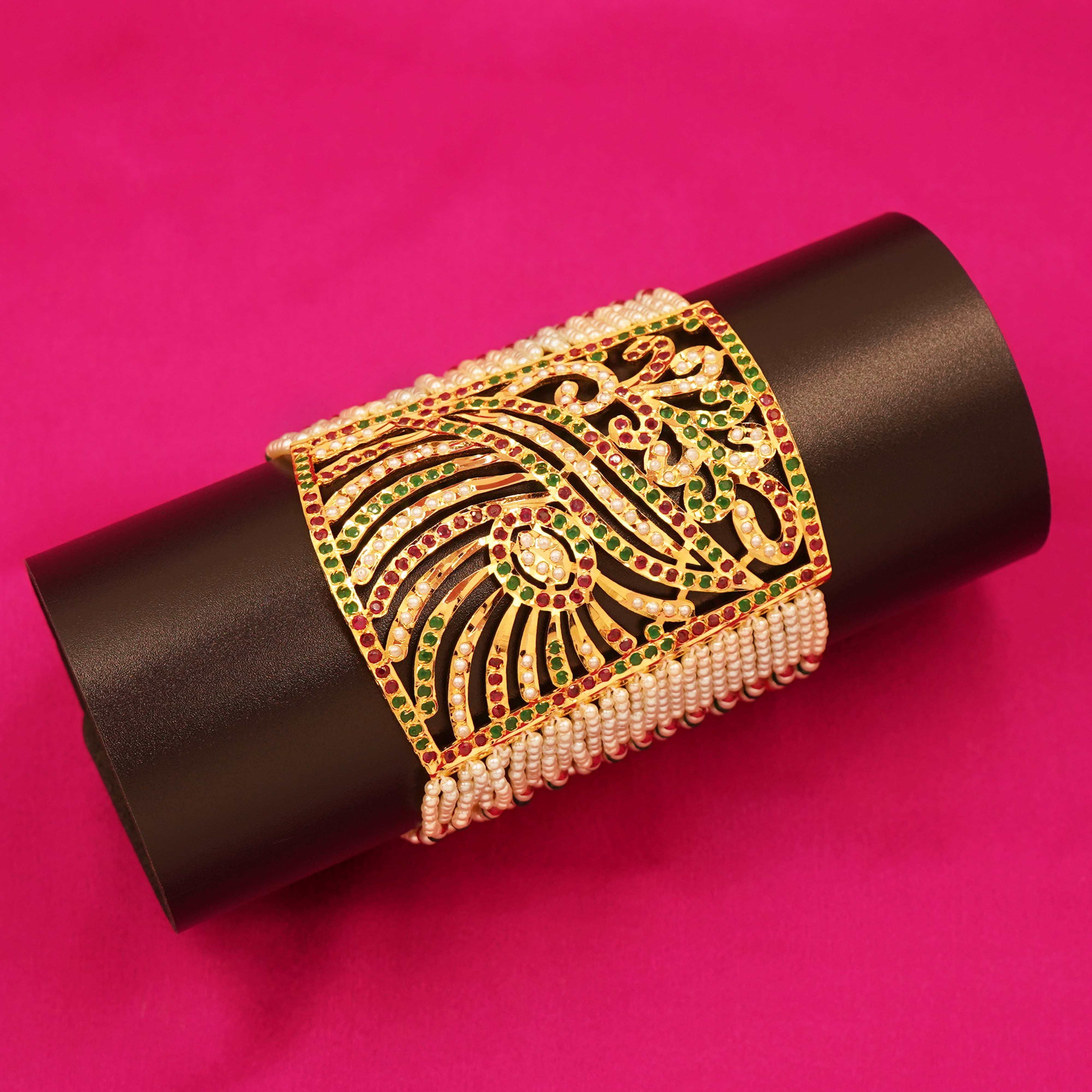 DESCRIPTION - This Jaipuri-style kada showcases a majestic peacock-inspired openwork design, adorned with red, green, and white Kundan stones. Gold-toned filigree and pearl-edged strands enhance its elegance. A perfect blend of tradition and artistry, ideal for weddings and festive occasions, it reflects the grandeur of Indian heritage with every intricate detail.