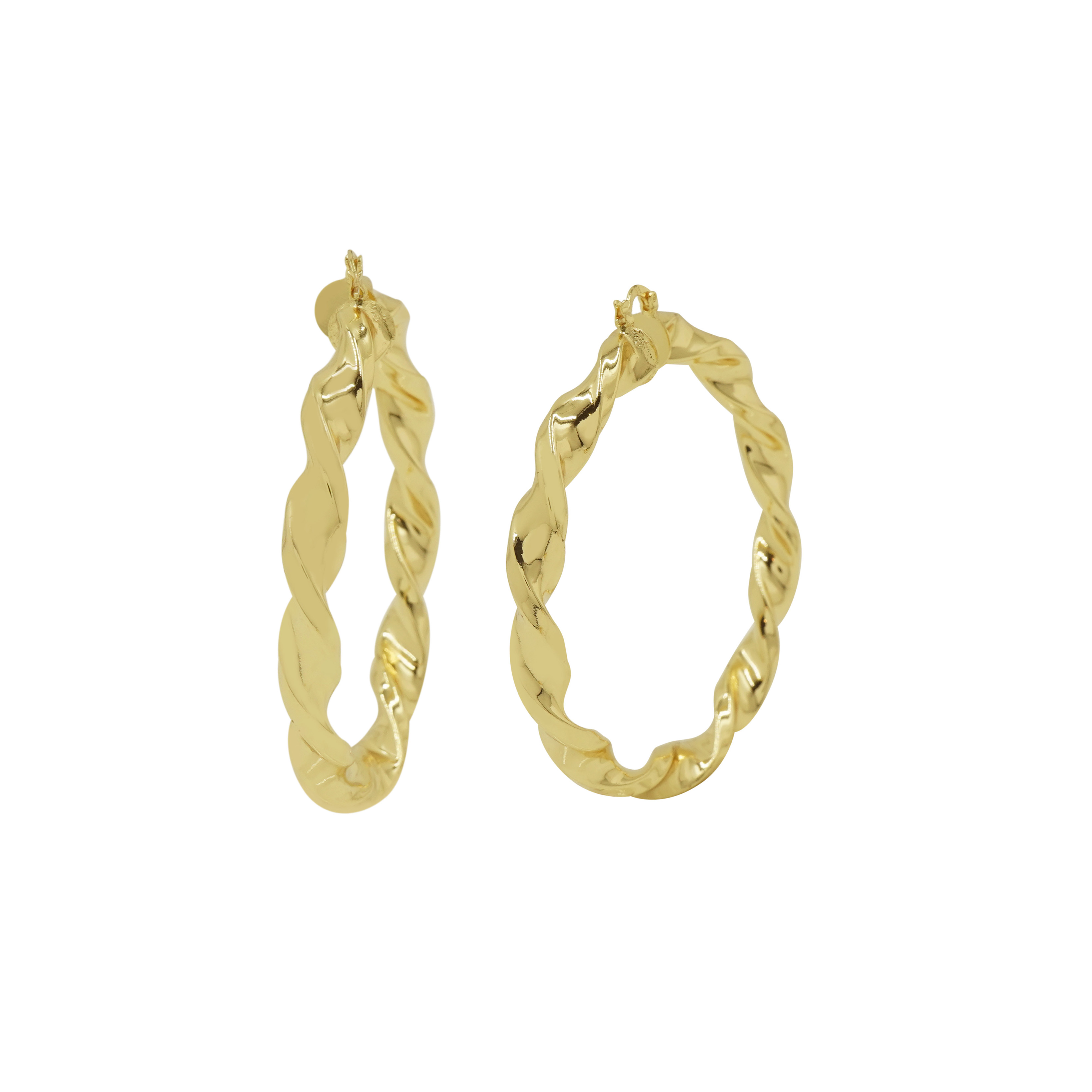 DESCRIPTION - These stunning twisted hoop earrings crafted in a lustrous gold finish. The elegant spiral design adds a modern twist to a classic hoop, making them perfect for both everyday wear and special occasions.