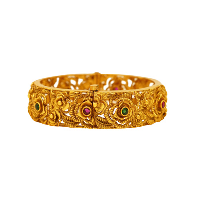 DESCRIPTION - THE ELEGANT BANGLES ARE FEATURING AN INTRICATE TRADITIONAL INDIAN DESIGN. THEY HAVE AN ANTIQUE OR MATTE FINISH AND ARE EMBELLISHED WITH SMALL RED AND GREEN STONES, LIKELY RUBIES AND EMERALDS OR THEIR CUBIC ZIRCONIA (CZ) SIMULANTS. THE DESIGN INCORPORATES DETAILED FLORAL OR LATTICE CUTWORK MOTIFS.