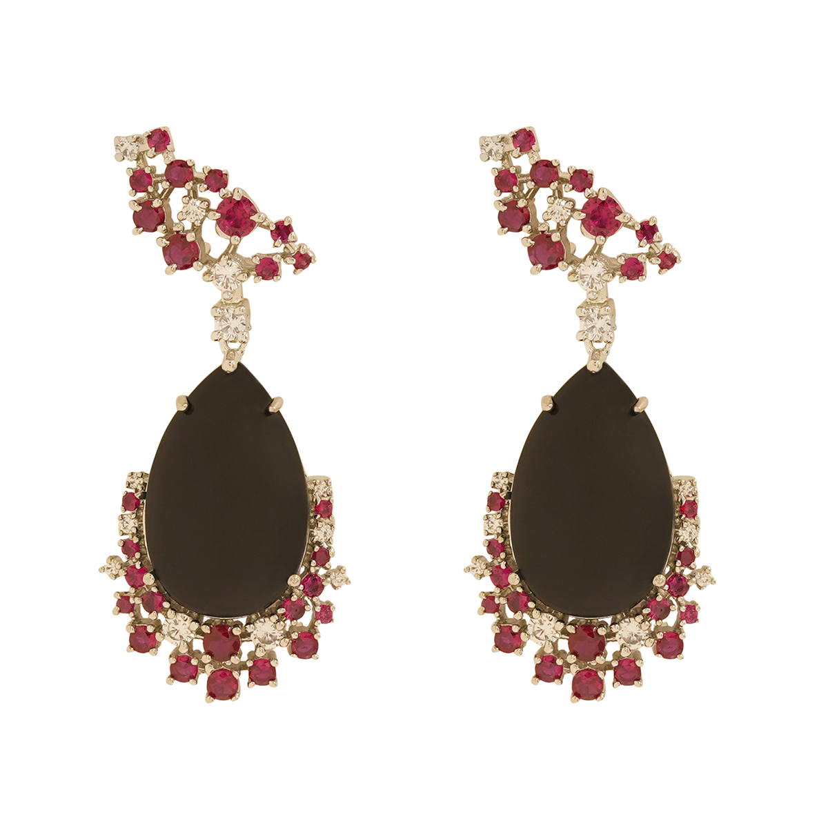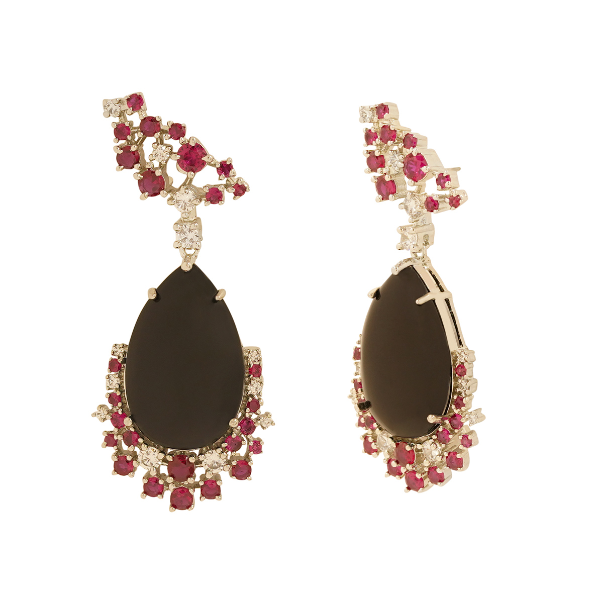 DESCRIPTION - These captivating earrings feature bold black teardrop stones framed by a stunning arrangement of ruby-toned and clear crystals. perfect for evening wear or special occasions. A statement piece that adds glamour and elegance to any outfit.