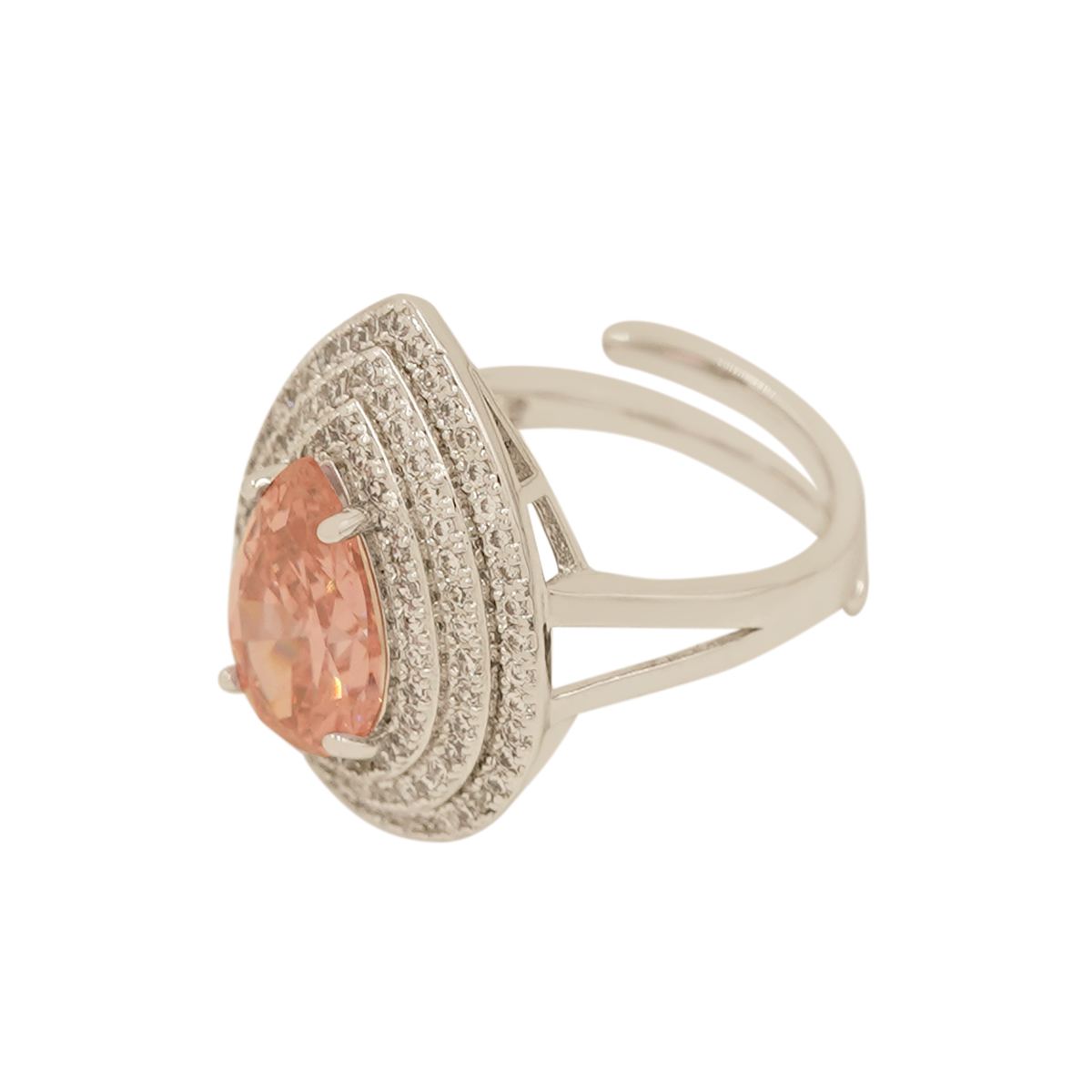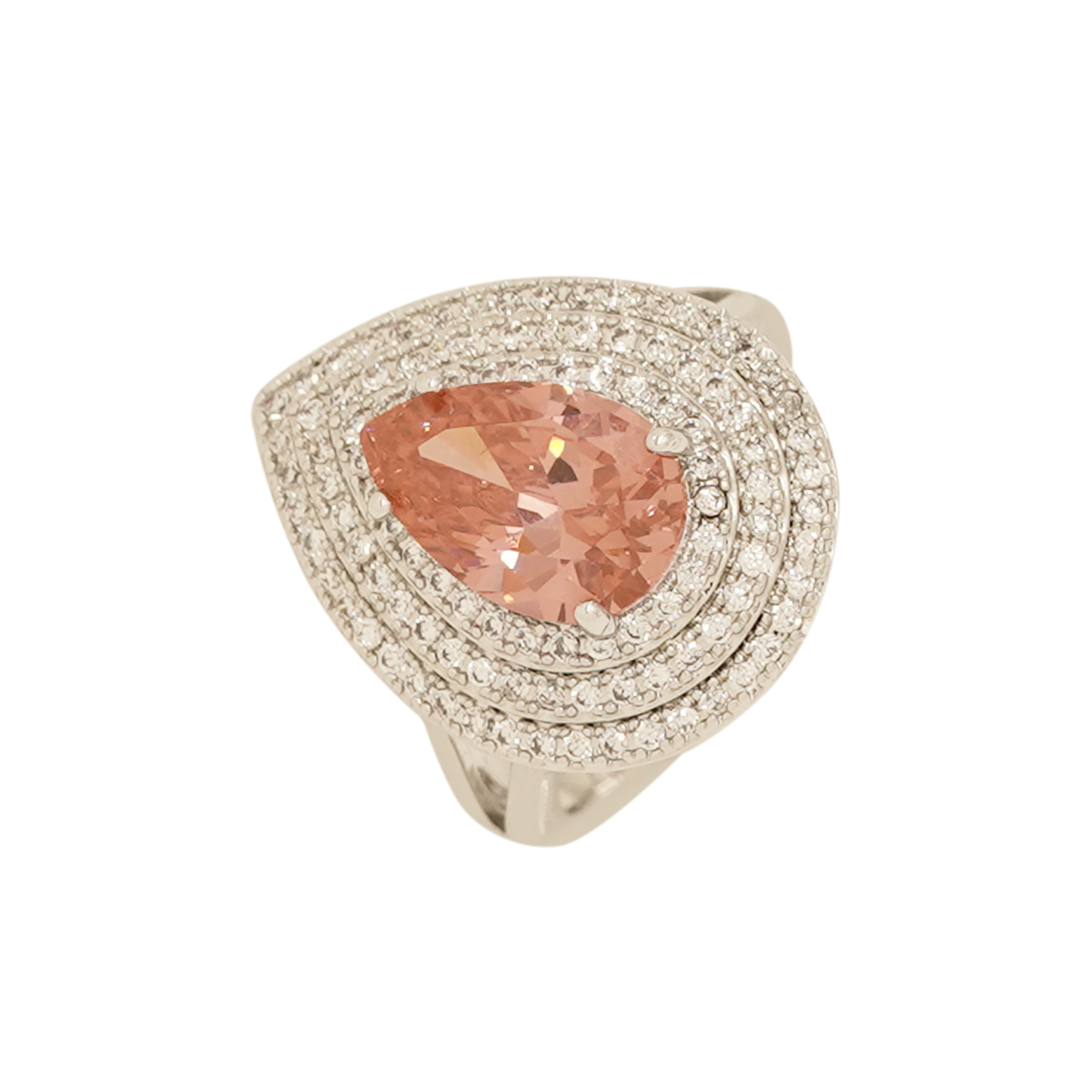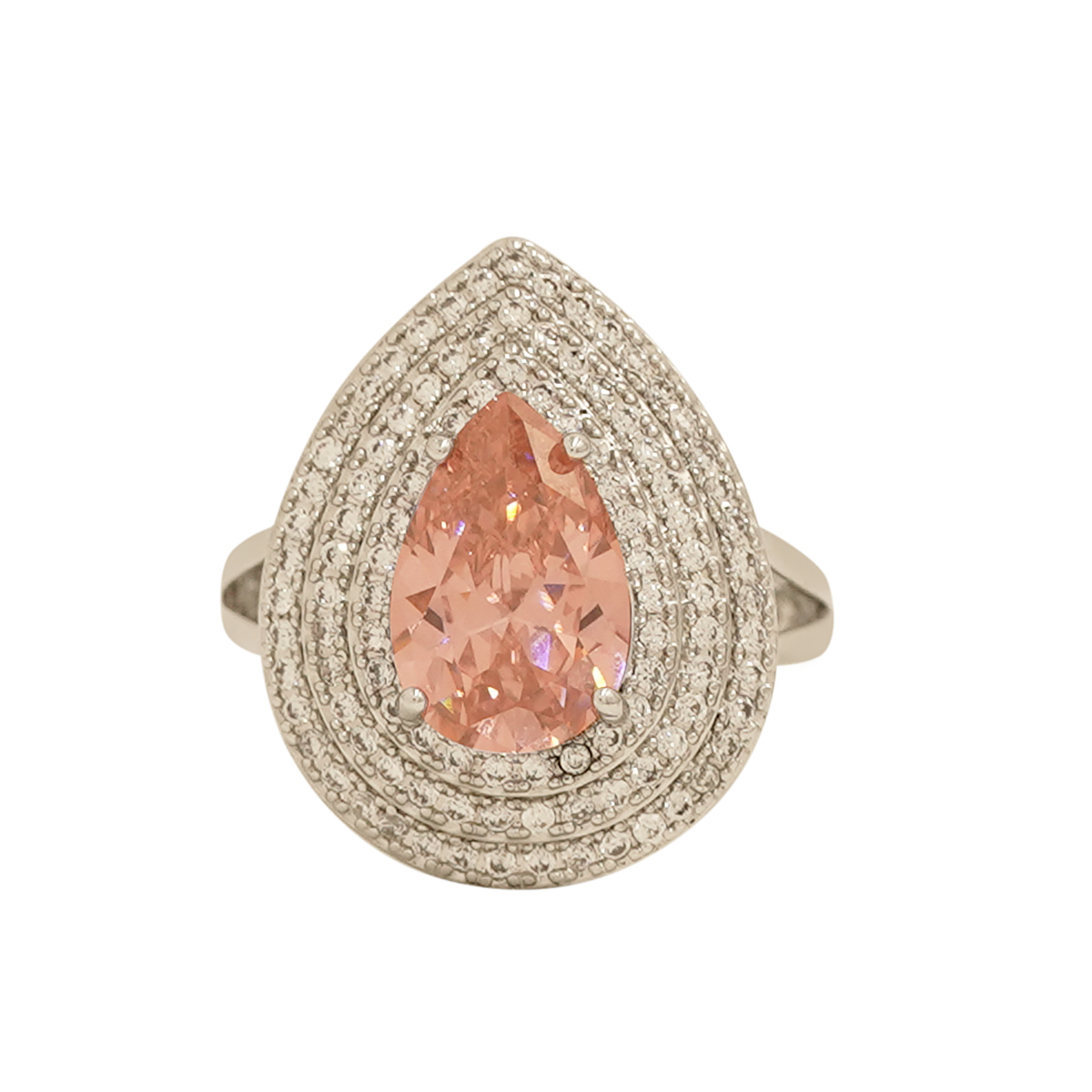 DESCRIPTION - This elegant ring features a sparkling pink teardrop gemstone surrounded by a double halo of shimmering diamonds Look. Its soft blush tone and radiant shine make it a perfect blend of luxury and grace.