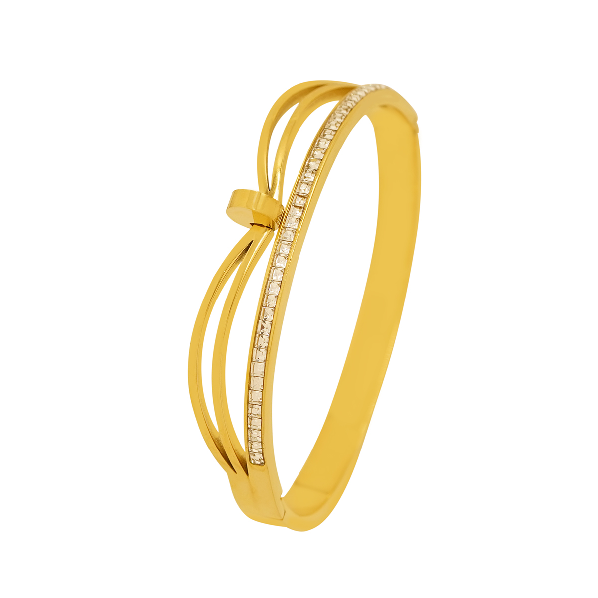 DESCRIPTION - This stylish bracelet features a graceful bow-inspired design paired with a sleek line of sparkling square-cut crystals, creating a perfect blend of charm and sophistication.