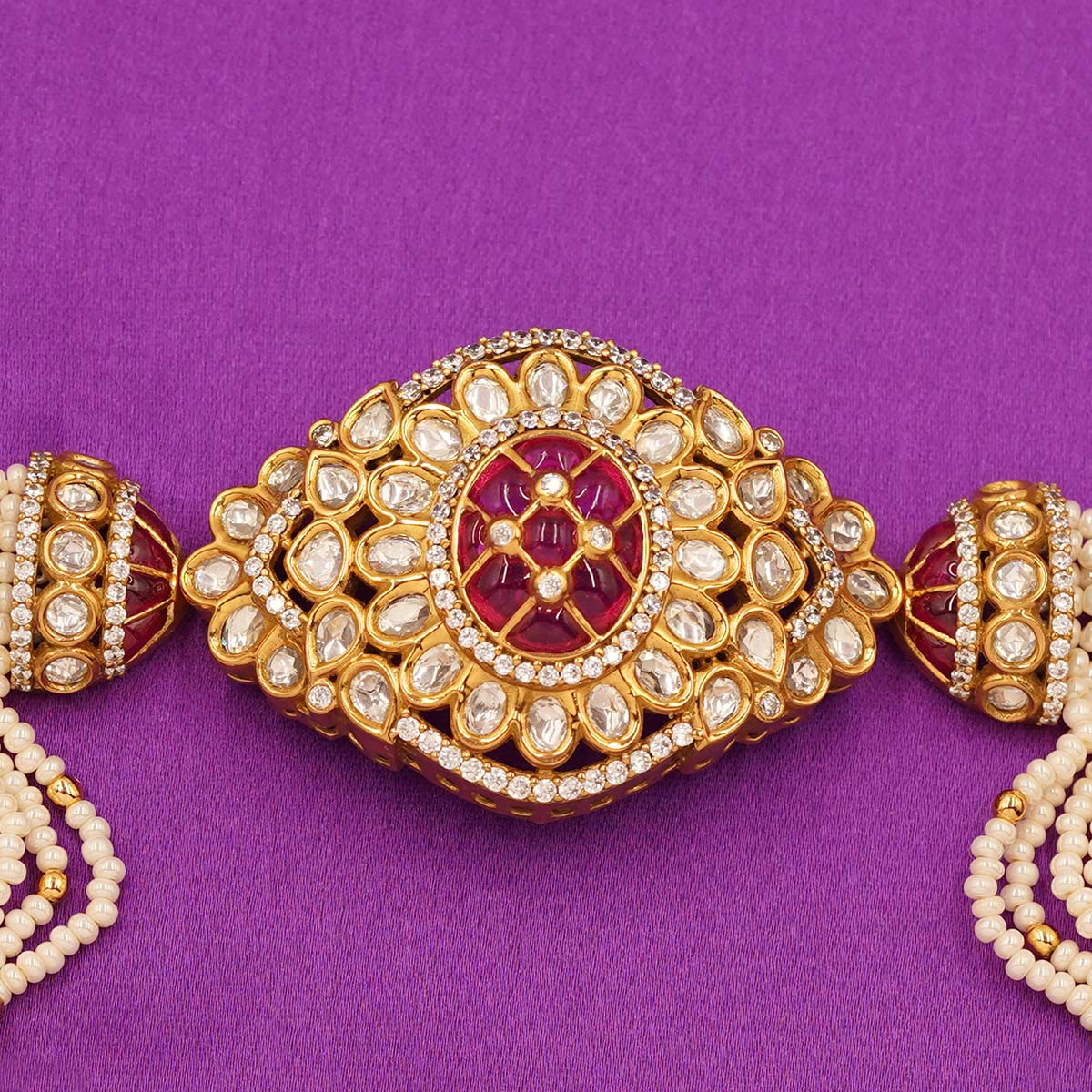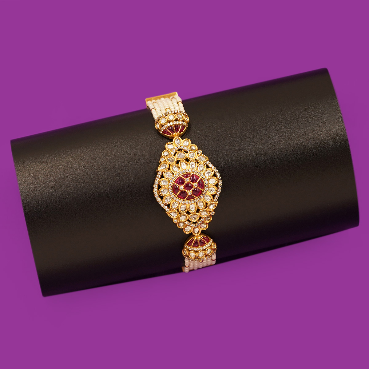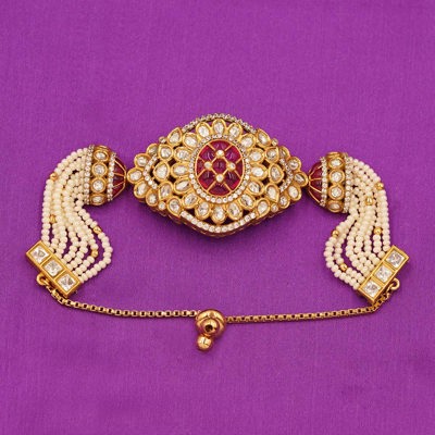 DESCRIPTION - This exquisite bracelet features a grand Kundan centerpiece adorned with ruby-red stones, surrounded by shimmering white Kundan work. The multi-layer pearl strands on both sides add a luxurious and royal touch, making it perfect for weddings, engagements, festivals, and traditional outfits.