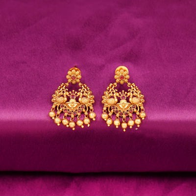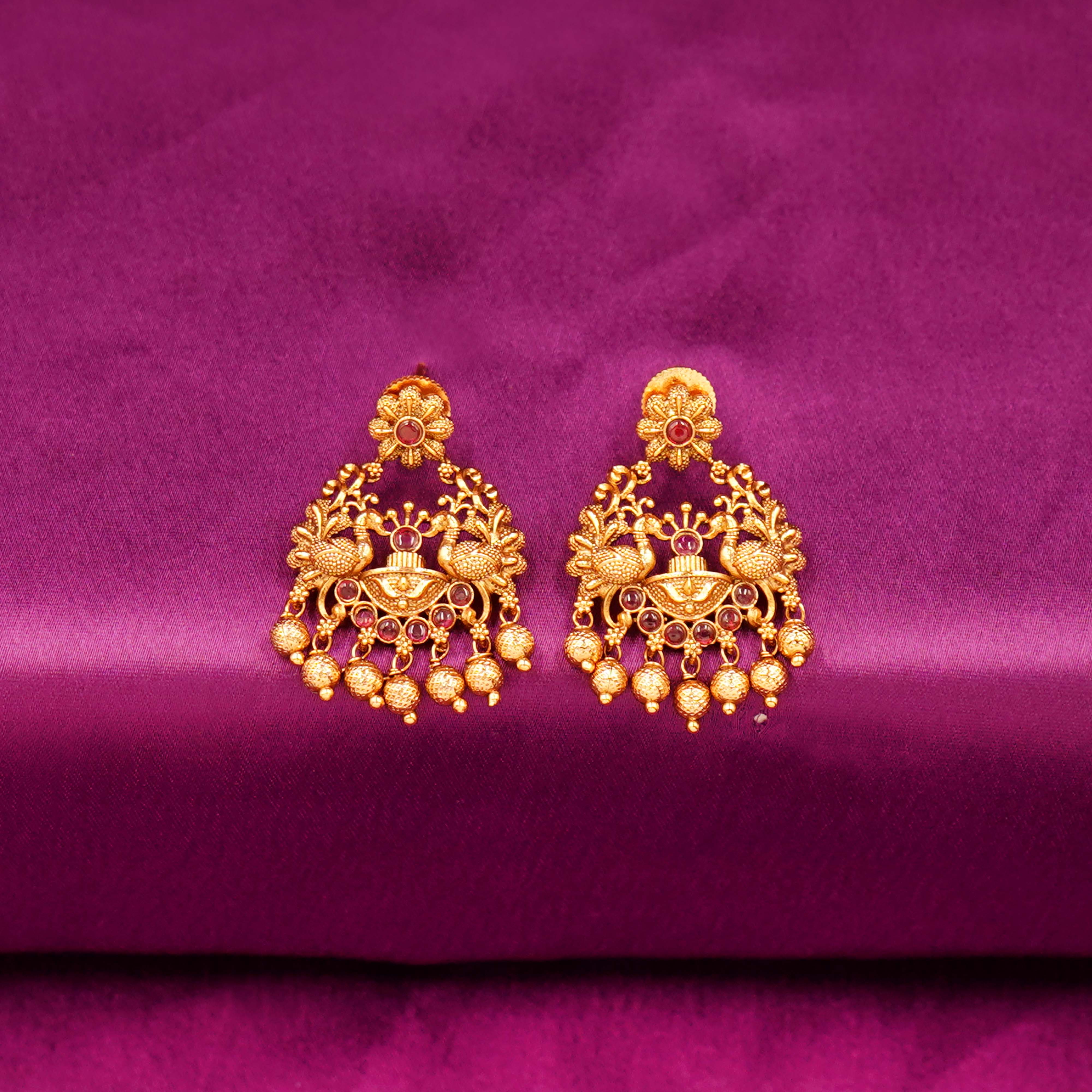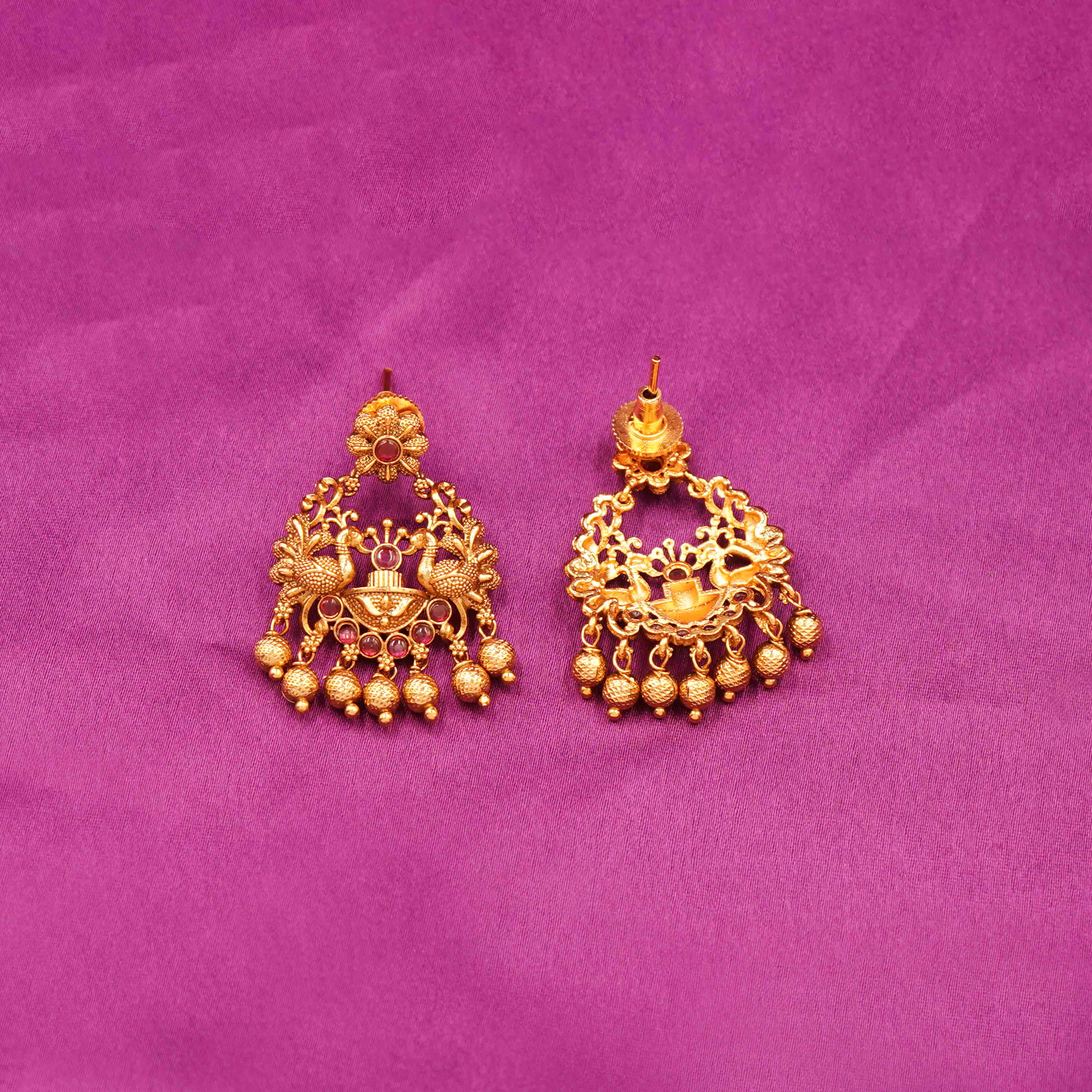 DESCRIPTION - CHANDBALI/EARRING, A PAIR OF EARRINGS IS TRADITIONAL INDIAN-STYLE EARRINGS, OFTEN REFERRED TO CHANDBALIS. A PAIR OF EARRINGS IS ORNATE FLORAL, PEACOCK MOTIFS AND INTRICATE GOLD-TONED METALWORK. EMBEDDED RED COLOR STONES, GIVING A RICH AND REGAL LOOK. HANGING GOLD-TONED GHANGHROO THAT ENHANCE MOVEMENT AND ELEGANCE.