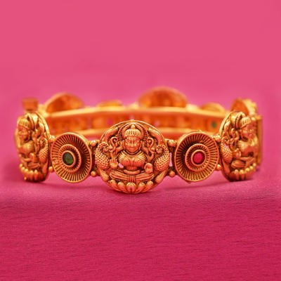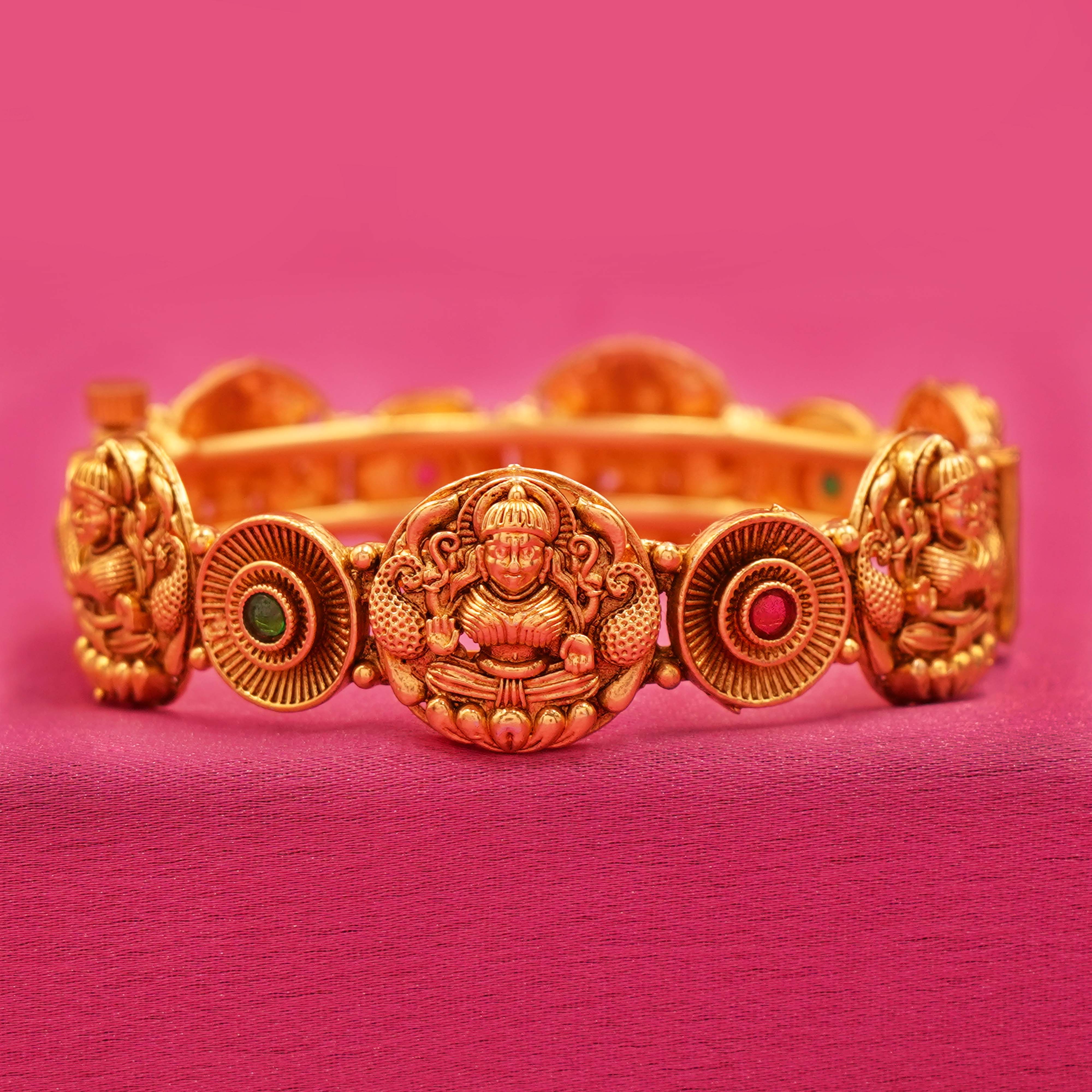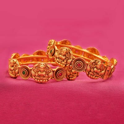 DESCRIPTION - ANTIQUE BANGLE/ BANGLE PAIR/ BANGLE, Gold-tone metal Bangles with Intricate Designs These exquisite gold-tone metal bangles feature elaborate craftsmanship, adorned with detailed circular motifs depicting deities and ornamental patterns. Embedded with vibrant red and green stones, they exude a touch of elegance and cultural richness