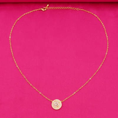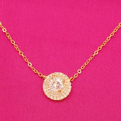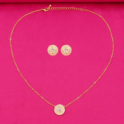 DESCRIPTION - PENDANT SET, NECKLACE SET CONSISTING OF A PAIR OF EARRINGS AND A NECKLACE. THE SET FEATURES A CLASSIC DESIGN WITH GOLD –PLATED SETTINGS AND ROUND BRILLIANT-CUT ZIRCON SURROUNDED BY TWO ROWS OF SMALLER STONES FOR A HALO EFFECT. NECKLACE SET CONSISTING OF A PAIR OF EARRINGS AND A NECKLACE.