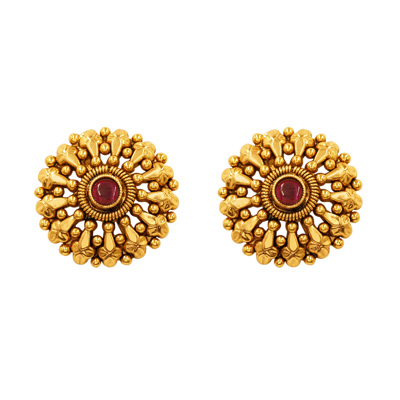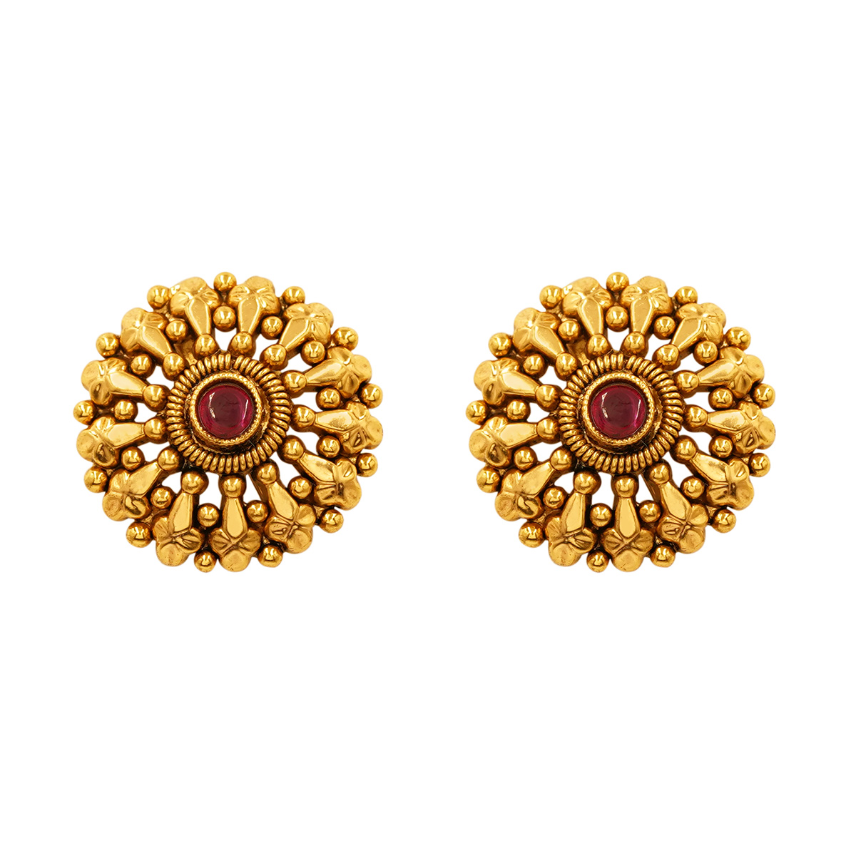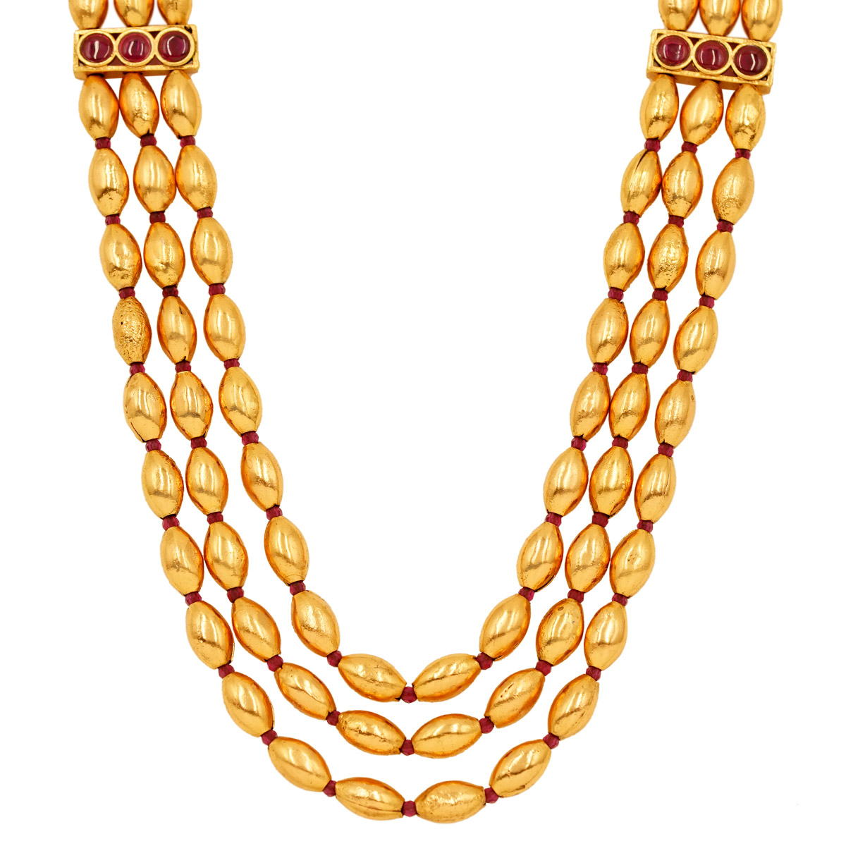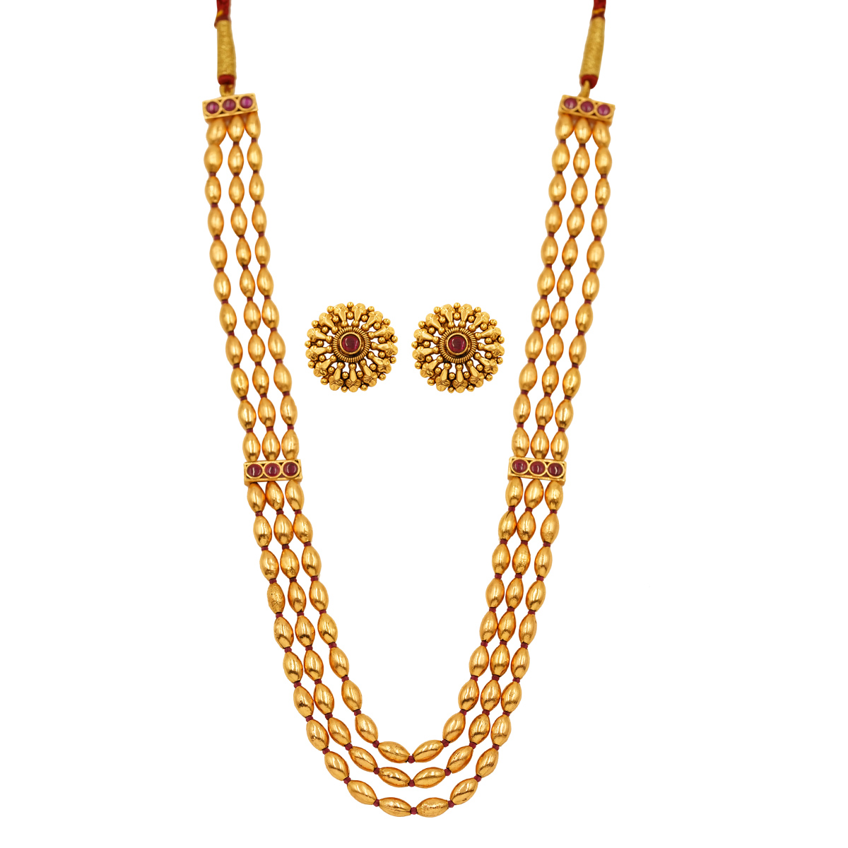 DESCRIPTION - This beautiful necklace set features a triple-layer beaded design with a rich golden tone and hints of ruby-colored detailing. Lightweight and elegant, this jewelry set pairs beautifully with sarees and ethnic outfits.