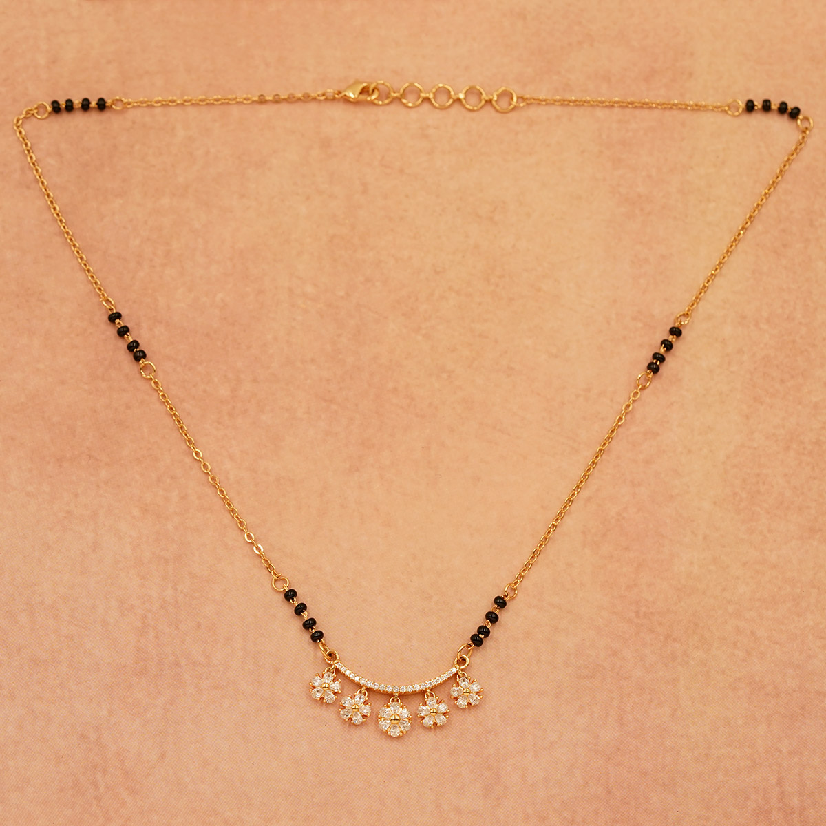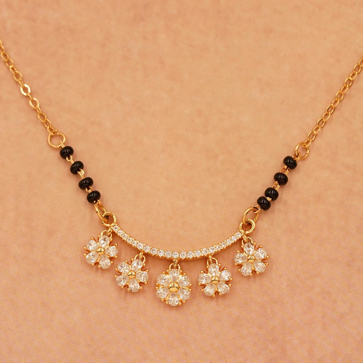 DESCRIPTION - This beautiful mangalsutra features a lightweight design with a dainty gold-tone chain accented by black beads and a floral pendant adorned with sparkling stones. Perfect for a subtle yet elegant everyday look.