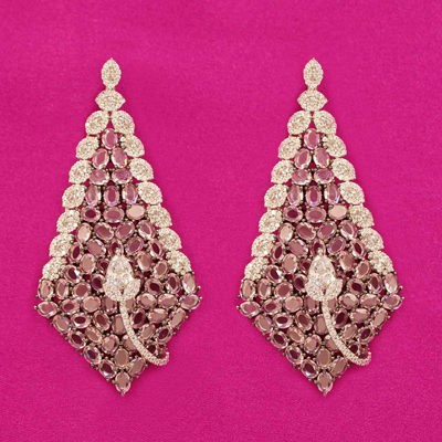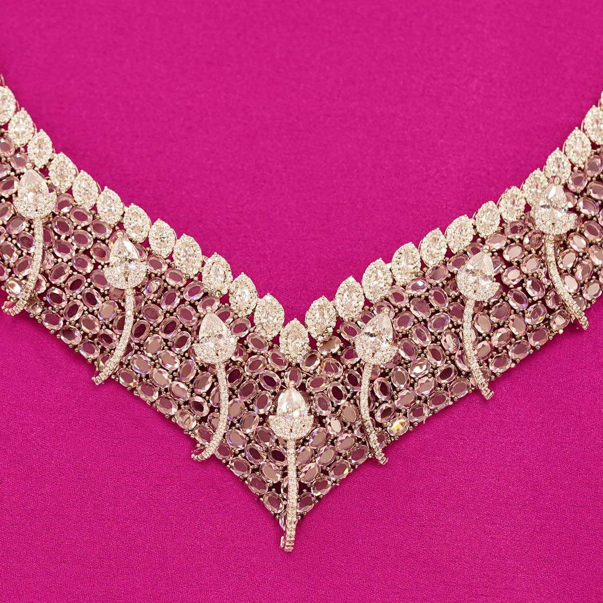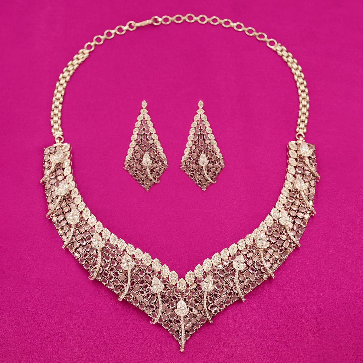 DESCRIPTION - An exquisite designer necklace set featuring a sophisticated leaf-inspired pattern adorned with shimmering stones. The matching earrings enhance its graceful V-shaped design — a perfect pick for weddings, receptions, and festive occasions.