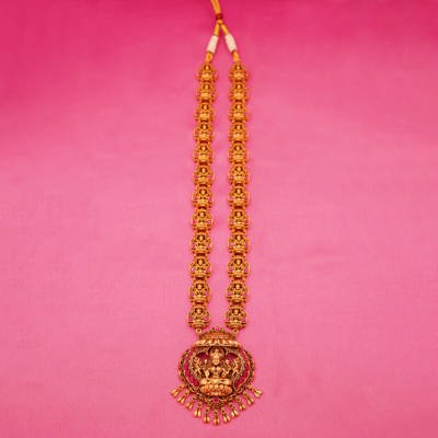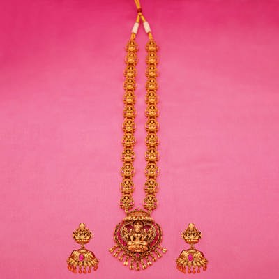 DESCRIPTION - LONG NECKLACE SET, THE NECKLACE SET IS A TRADITIONAL SOUTH INDIAN “TEMPLE JEWELRY” SET, CRAFTED IN A GOLD-TONE METAL WITH PINK STONE ACCENTS. THE NECKLACE SET IS A TRADITIONAL INDIAN JEWELRY SET, LIKELY MADE IN A TEMPLE OR ANTIQUE STYLE.