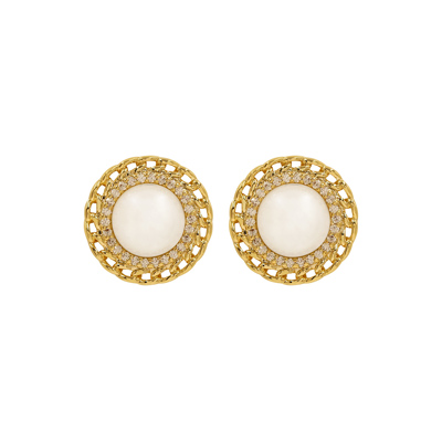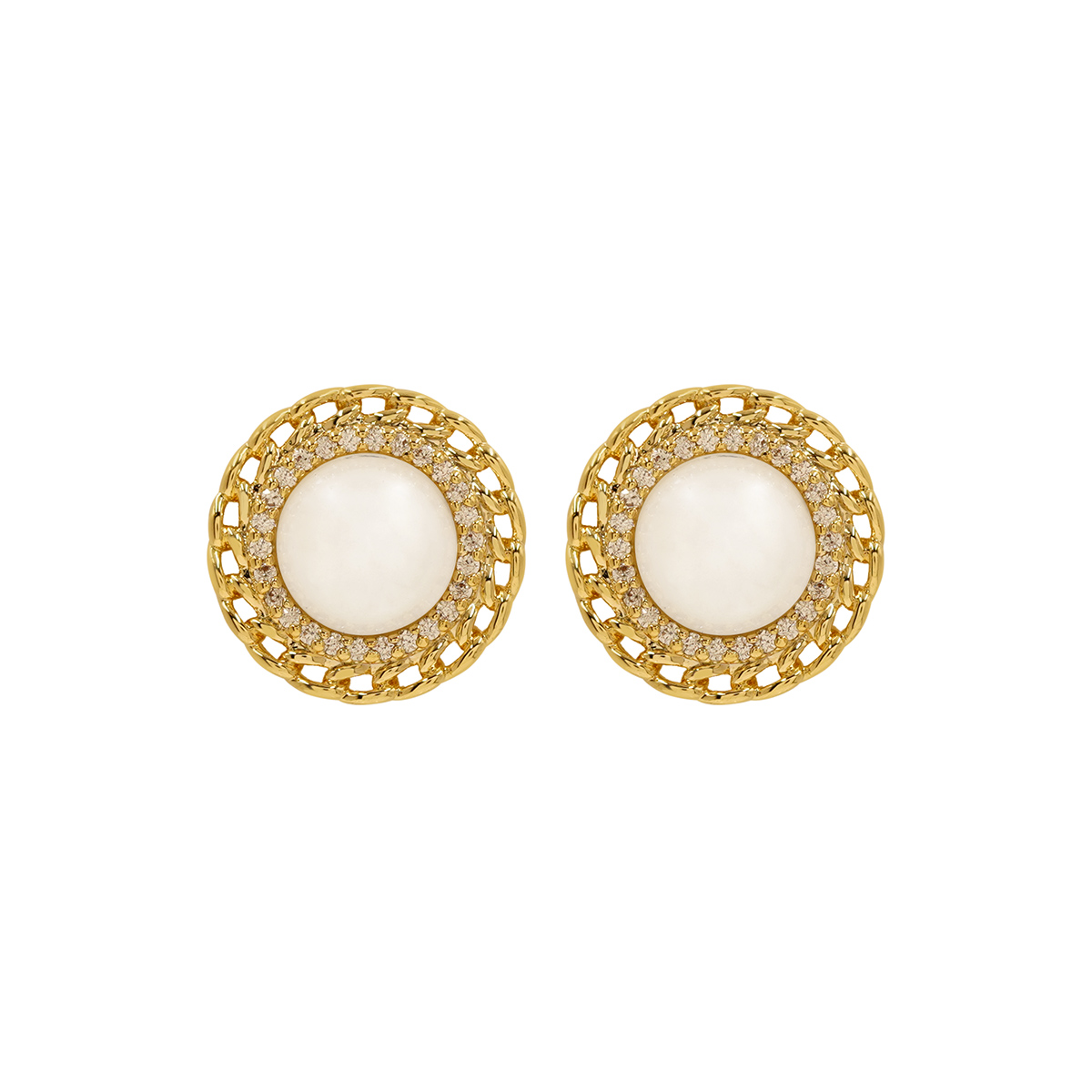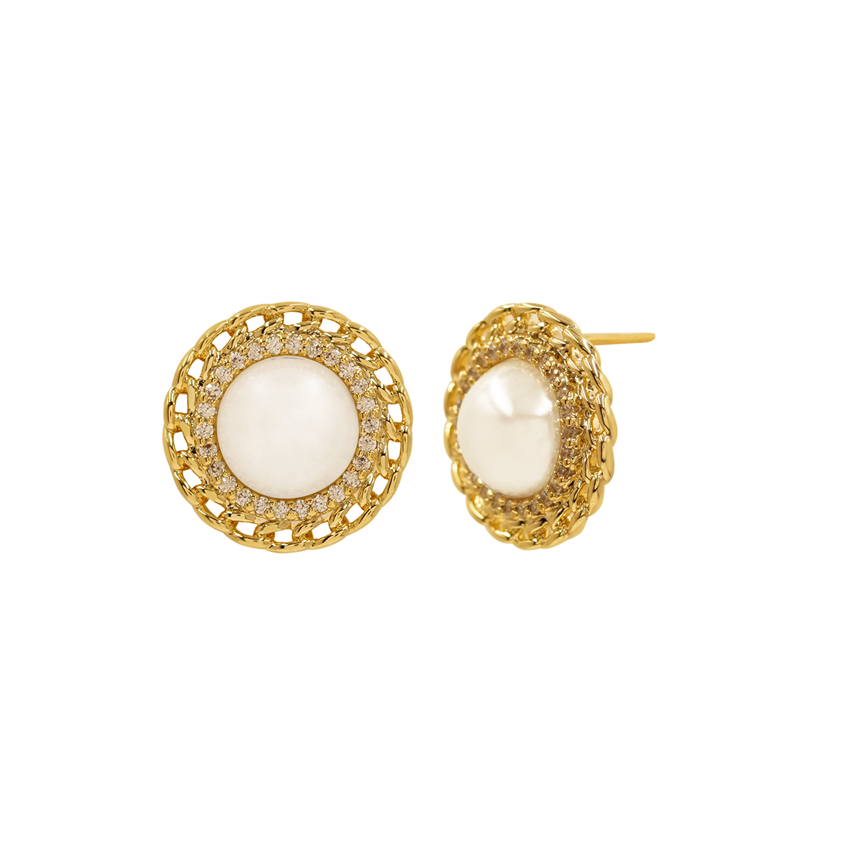DESCRIPTION - These elegant stud earrings feature a luminous pearl at the center, framed by a beautifully crafted gold-toned filigree border. The intricate lace-like detailing adds a touch of vintage charm, making these studs perfect for both everyday sophistication and special occasions.