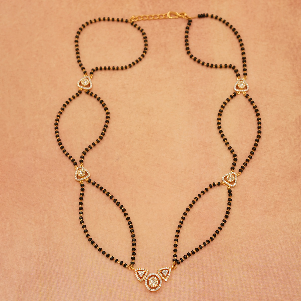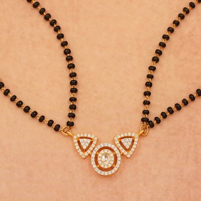 DESCRIPTION - This graceful mangalsutra set features a sleek double-layered black bead chain adorned with delicate golden and stone-studded accents. Designed for modern elegance, it beautifully complements both traditional and contemporary looks.