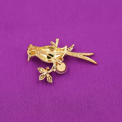 Elegant Crystal Bird Brooch with Green Gem, Pearl Drop & Floral Accent
