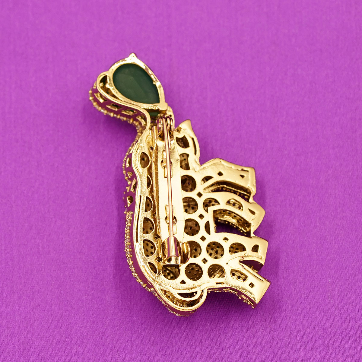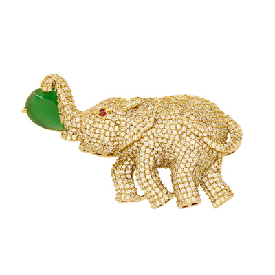 DESCRIPTION - This stunning brooch features a gracefully crafted elephant, fully adorned with shimmering micro-stones that give it a luxurious sparkling finish. With its trunk lifted high, the elephant holds a large green faceted crystal, symbolizing prosperity, good luck, and positive energy.
