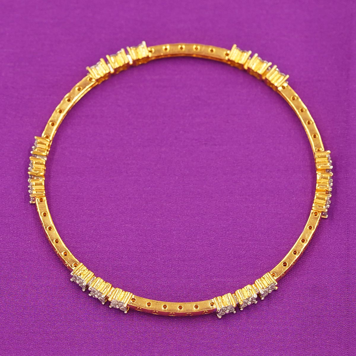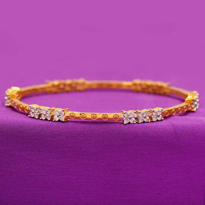 DESCRIPTION - This graceful bangle pair features a slim gold-finish design adorned with sparkling floral clusters along the front. The neat detailing and bright stones add a refined shimmer, making it ideal for everyday wear, festive looks, and traditional outfits. Lightweight, comfortable, and stylish — a beautiful pair to enhance any jewellery collection.