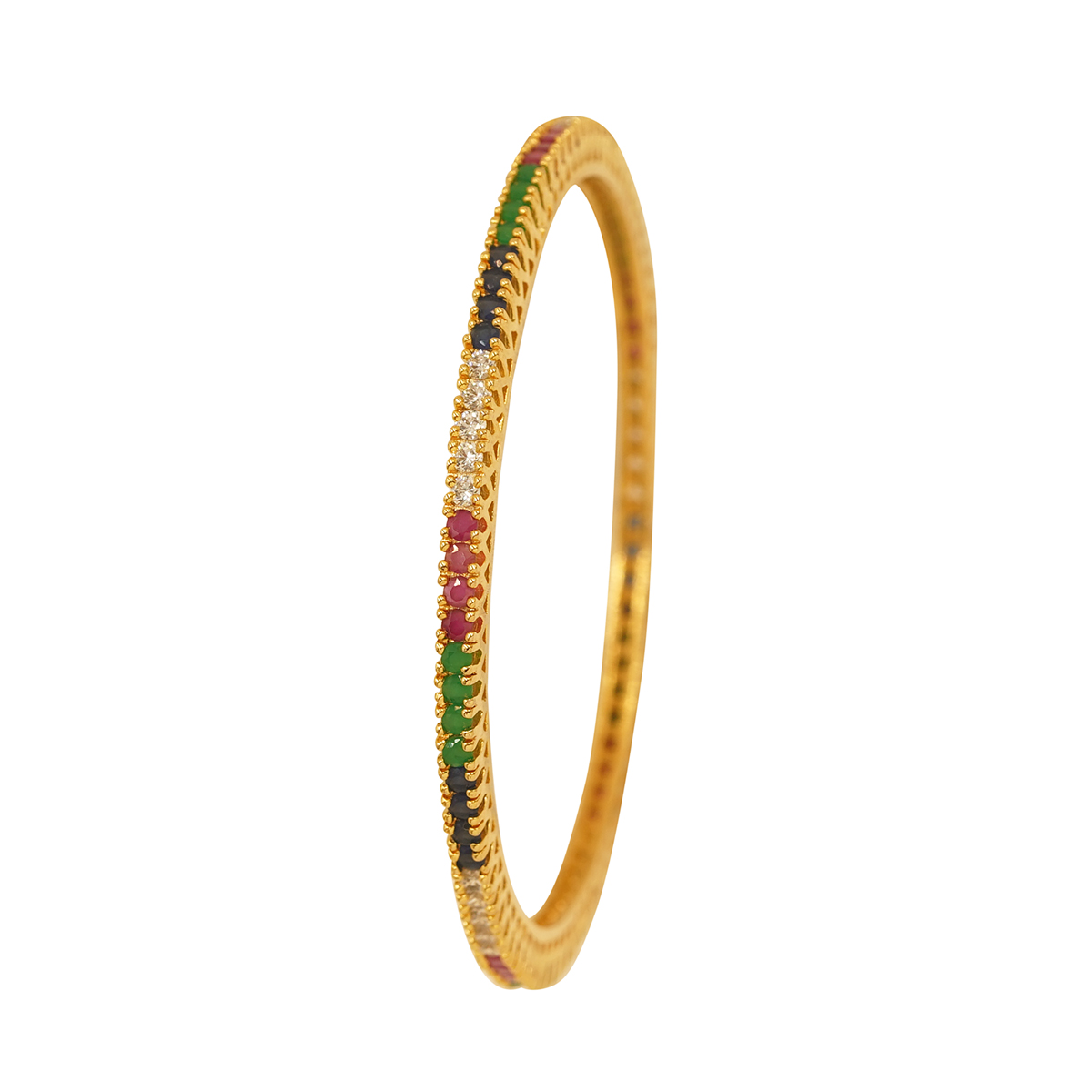 DESCRIPTION - THESE BEAUTIFULLY CRAFTED GOLD BANGLES FEATURE A REFINED COMBINATION OF MULTICOLORED STONES IN SHADES OF GREEN, RED, AND WHITE. THE TRIPLE-LINE STONE ARRANGEMENT GIVES THEM A VIBRANT YET SOPHISTICATED APPEAL, MAKING THEM PERFECT FOR FESTIVE WEAR, TRADITIONAL OUTFITS, AND SPECIAL OCCASIONS.