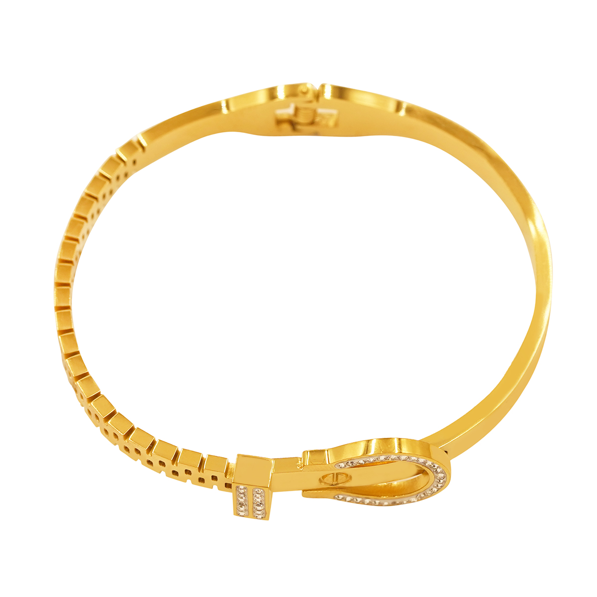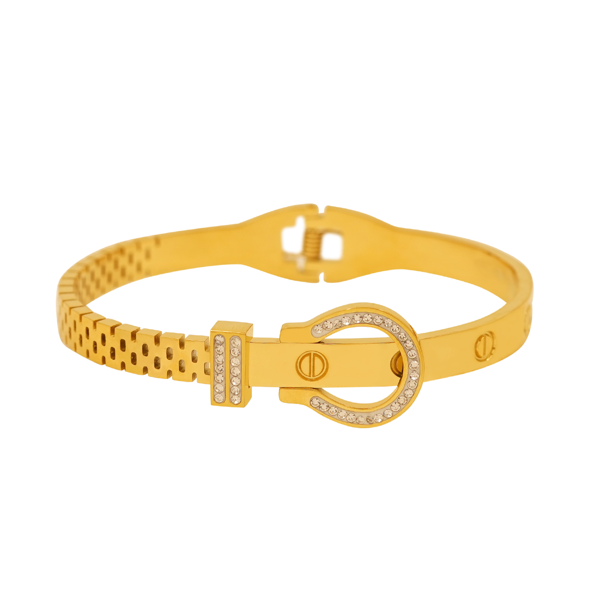 DESCRIPTION - A stylish designer bracelet featuring a bold horseshoe-shaped centrepiece adorned with sparkling crystals. The sleek polished band paired with a unique patterned side design gives it a premium and modern look. Perfect for daily fashion, parties, and gifting — this bracelet adds effortless charm to any outfit.