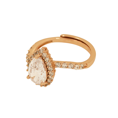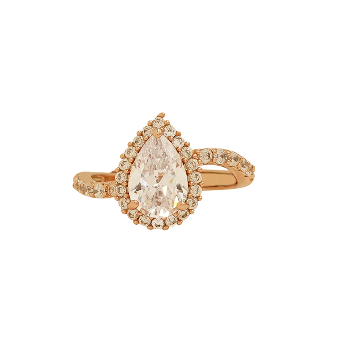 DESCRIPTION - This stunning ring features a brilliant pear-cut center stone surrounded by shimmering micro stones. The twisted band design adds a modern and elegant touch, making it perfect for parties, events, or everyday glamour.