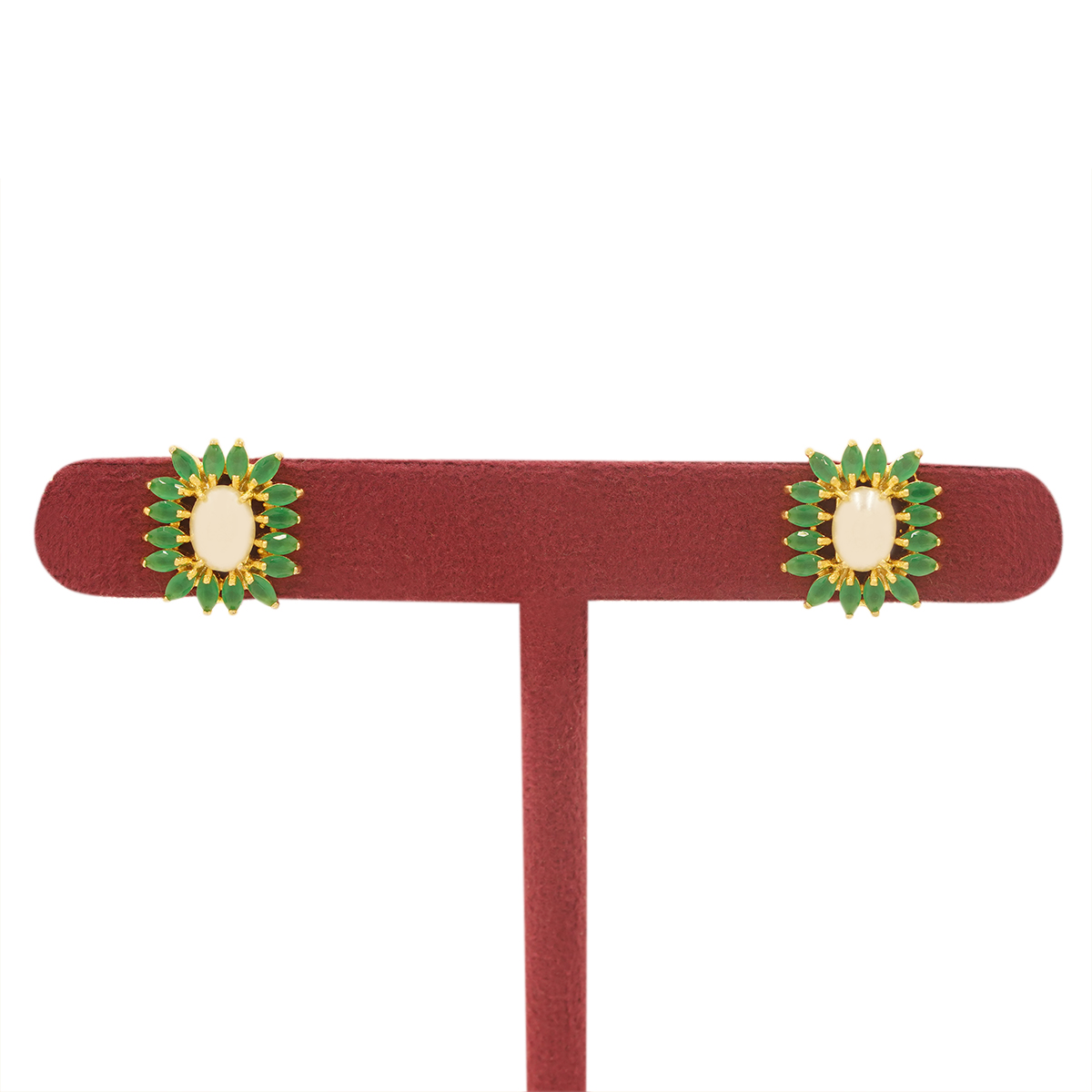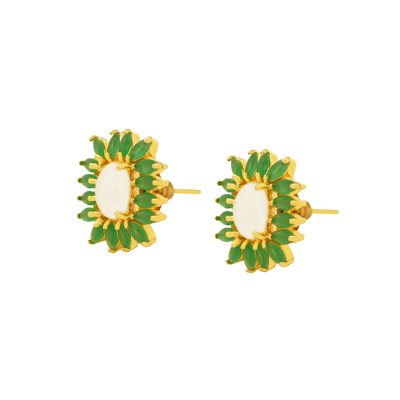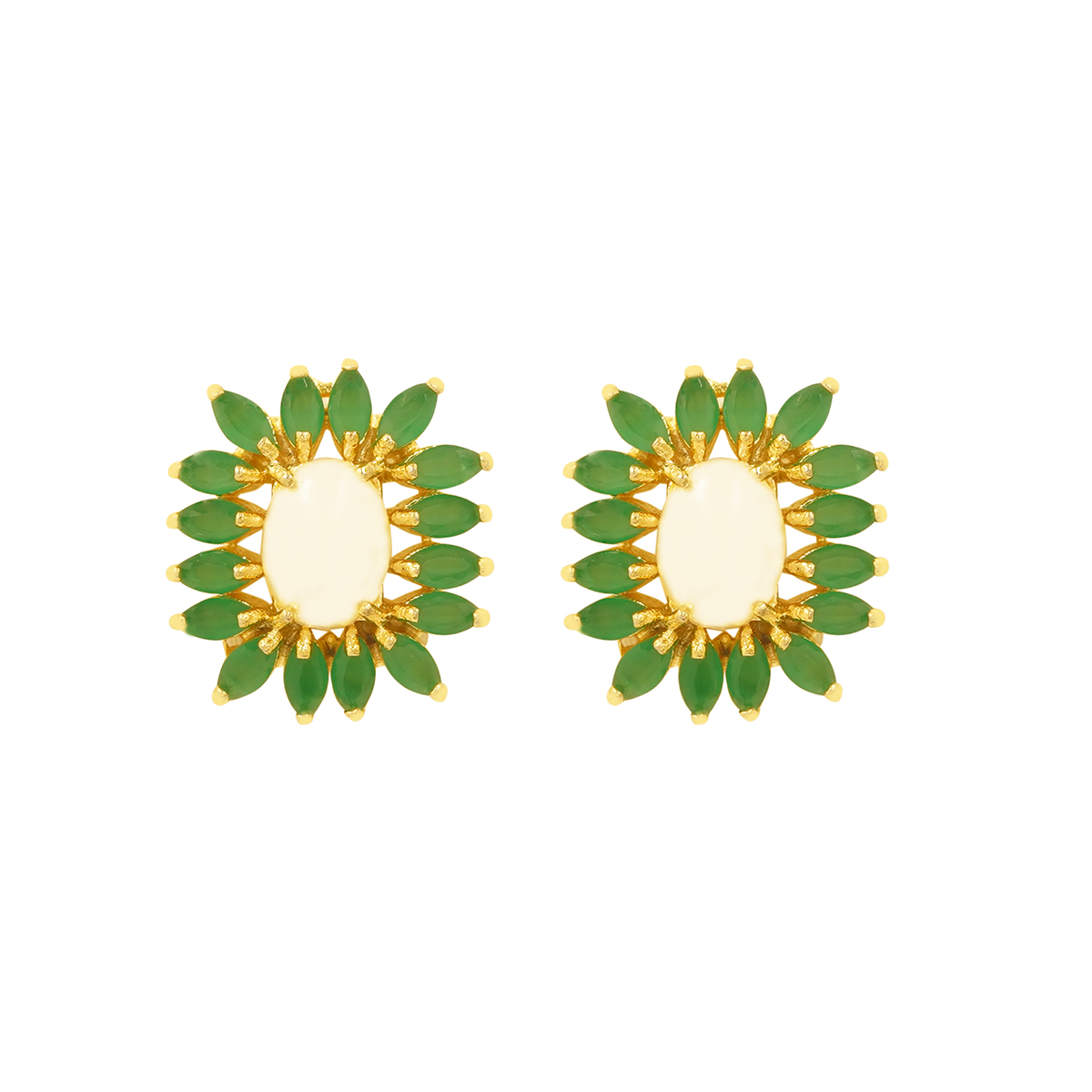 DESCRIPTION - INSPIRED BY NATURE’S ELEGANCE, THESE EMERALD BLOOM PEARL STUD EARRINGS FEATURE LEAF-SHAPED GREEN STONES ARRANGED IN A RADIANT FLORAL PATTERN. AT THE CENTER SITS A SOFT IVORY PEARL, BEAUTIFULLY HIGHLIGHTED BY WARM GOLD-TONED DETAILING THAT ADDS RICHNESS WITHOUT OVERPOWERING THE LOOK.