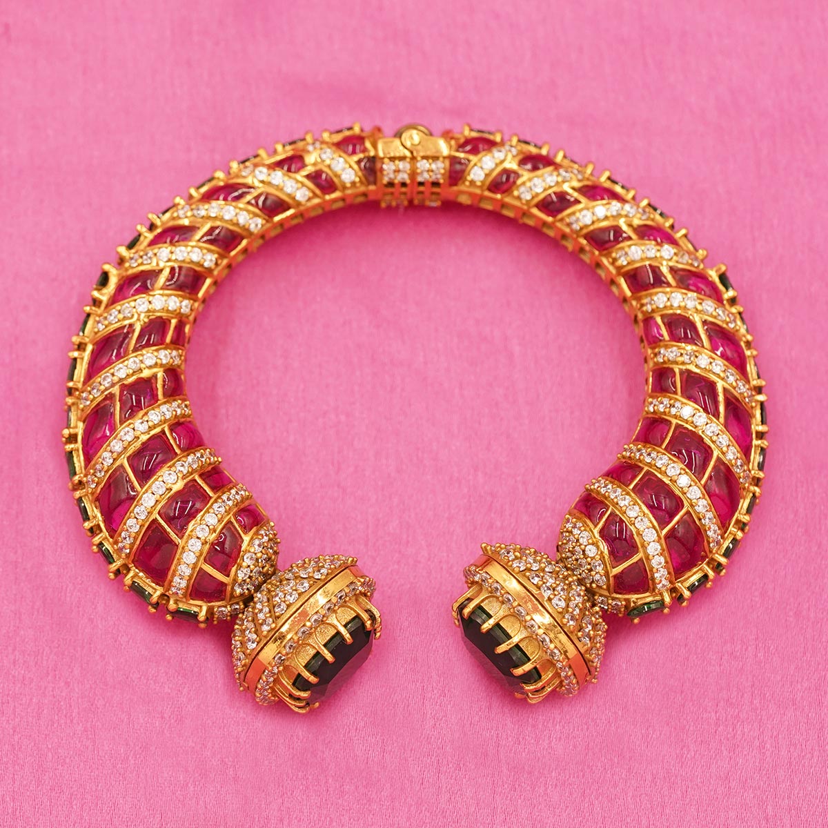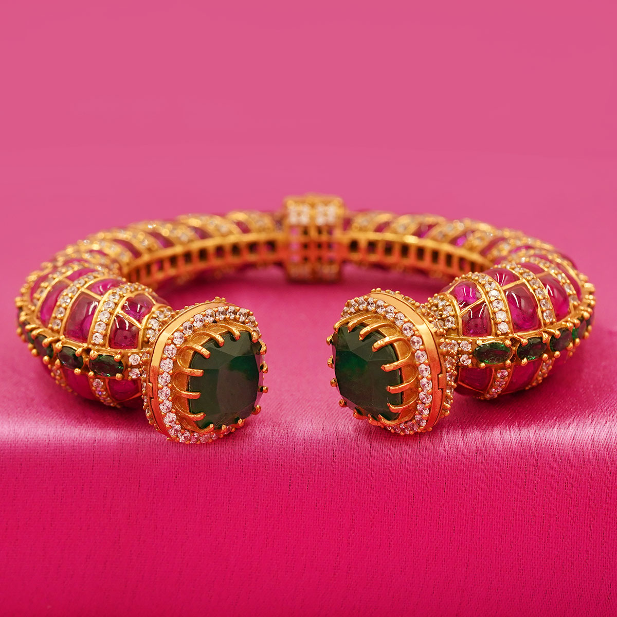 DESCRIPTION - This premium designer bangle features a striking combination of a bold emerald-green center stone paired with rich ruby-red accents, all set in an elegant gold-finish frame. The cushion-cut green stone at both ends creates a luxurious focal point, surrounded by delicate shimmering embellishments for added brilliance.