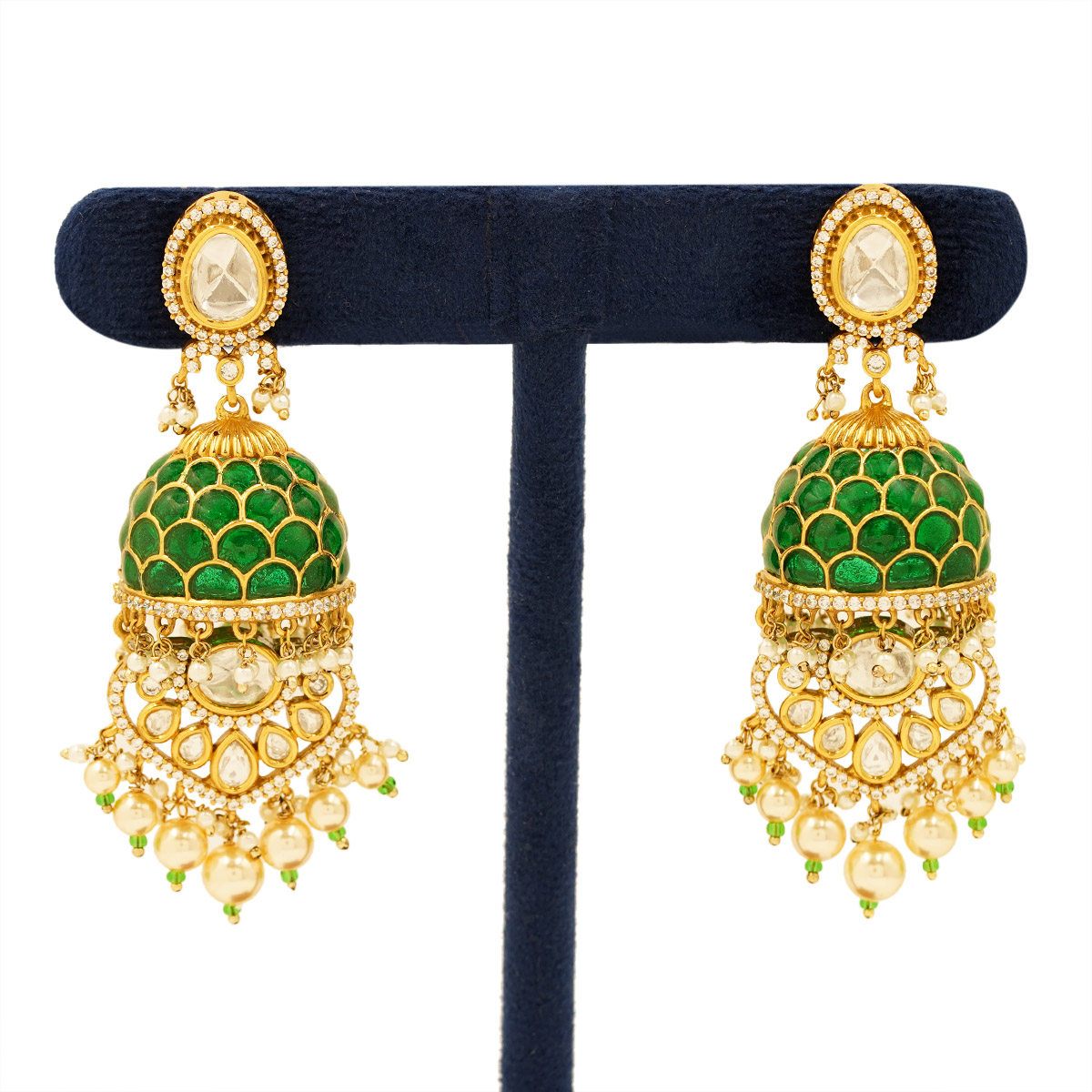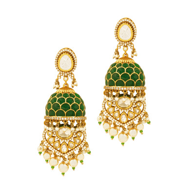 DESCRIPTION - GRACEFULLY TRADITIONAL WITH A TOUCH OF ROYAL CHARM, THESE EMERALD KUNDAN JHUMKA EARRINGS ARE A CELEBRATION OF TIMELESS INDIAN CRAFTSMANSHIP. FEATURING A RICH GREEN ENAMEL DOME ADORNED WITH INTRICATE GOLD TONE DETAILING, EACH JHUMKA IS ACCENTED WITH RADIANT KUNDAN STONES AND FINISHED WITH DELICATE PEARL DROPS FOR A SOFT, ELEGANT MOVEMENT. PERFECT FOR WEDDINGS, FESTIVE OCCASIONS, AND ETHNIC CELEBRATIONS, THESE EARRINGS ADD A LUXURIOUS STATEMENT TO SAREES, LEHENGAS, AND ANARKALIS. A MUST-HAVE FOR THOSE WHO ADORE CLASSIC ELEGANCE WITH A CONTEMPORARY SPARKLE.