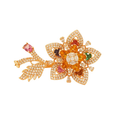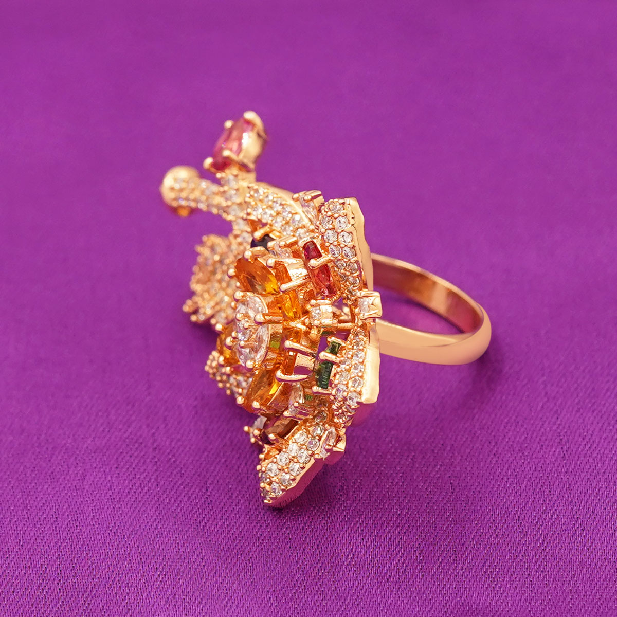 DESCRIPTION - This luxurious cocktail ring blooms with a dazzling arrangement of golden, pink, and multicolor stones set in a radiant gold finish. The intricate layered design and pavé detailing add exceptional sparkle, making it a standout statement piece. Perfect for weddings, parties, and grand festive looks that demand pure elegance.
