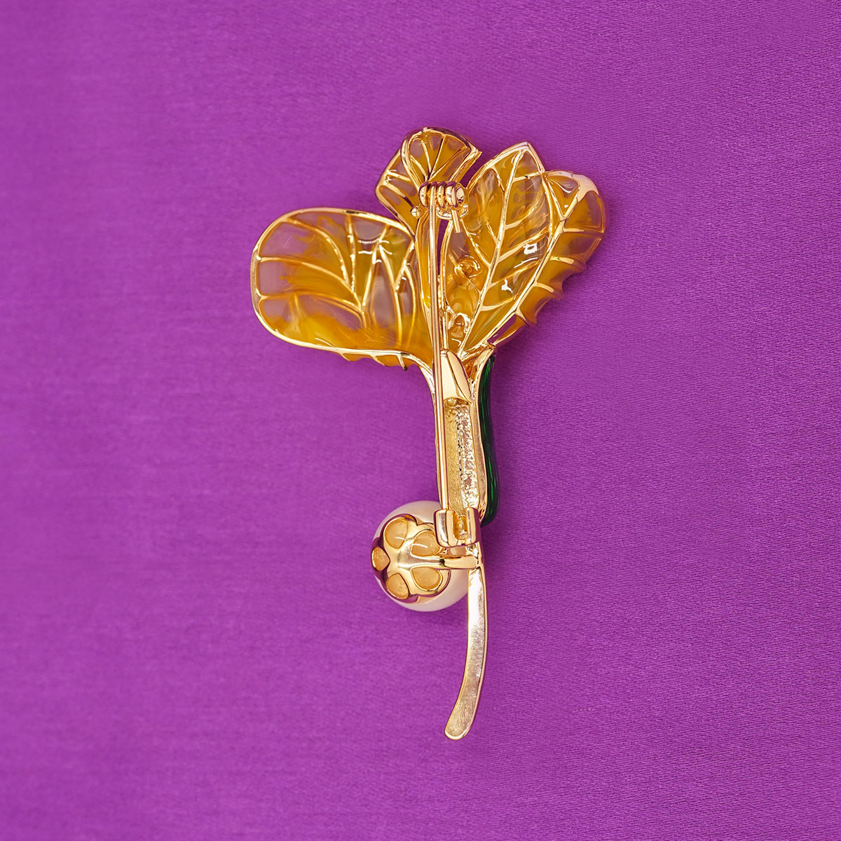 DESCRIPTION - A rich emerald-green enamel stem adds a fresh pop of color, while a classic pearl accent at the base completes the design with timeless sophistication. The combination of gold, enamel, crystal, and pearl creates a luxurious, high-end look.