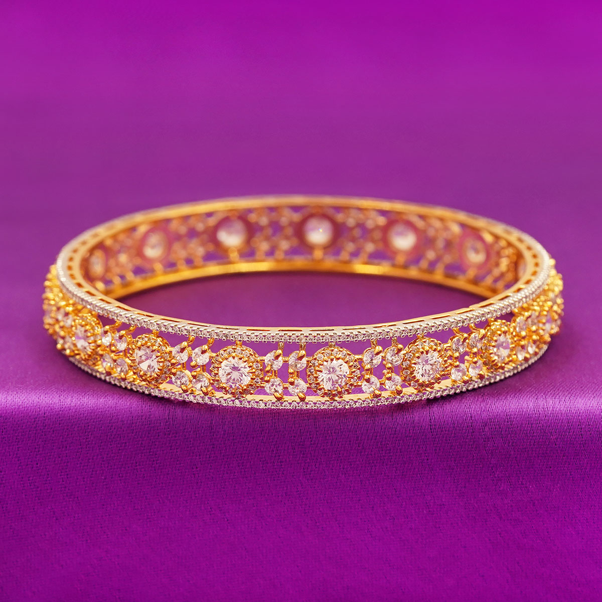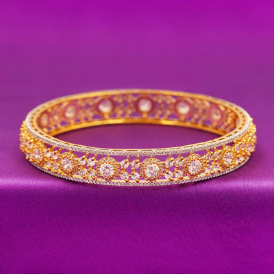 DESCRIPTION - This elegant pair of bangles features a beautiful floral cutwork design highlighted with sparkling round stones. Crafted in a premium golden-finish metal, the bangles offer a luxurious yet traditional appeal. perfect for weddings, festive occasions, and special events. Lightweight, durable, and eye-catching — these bangles add an instant touch of grace to any outfit.