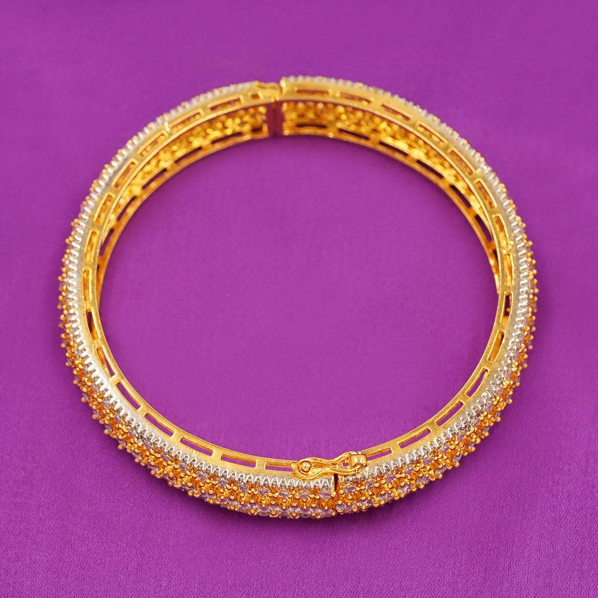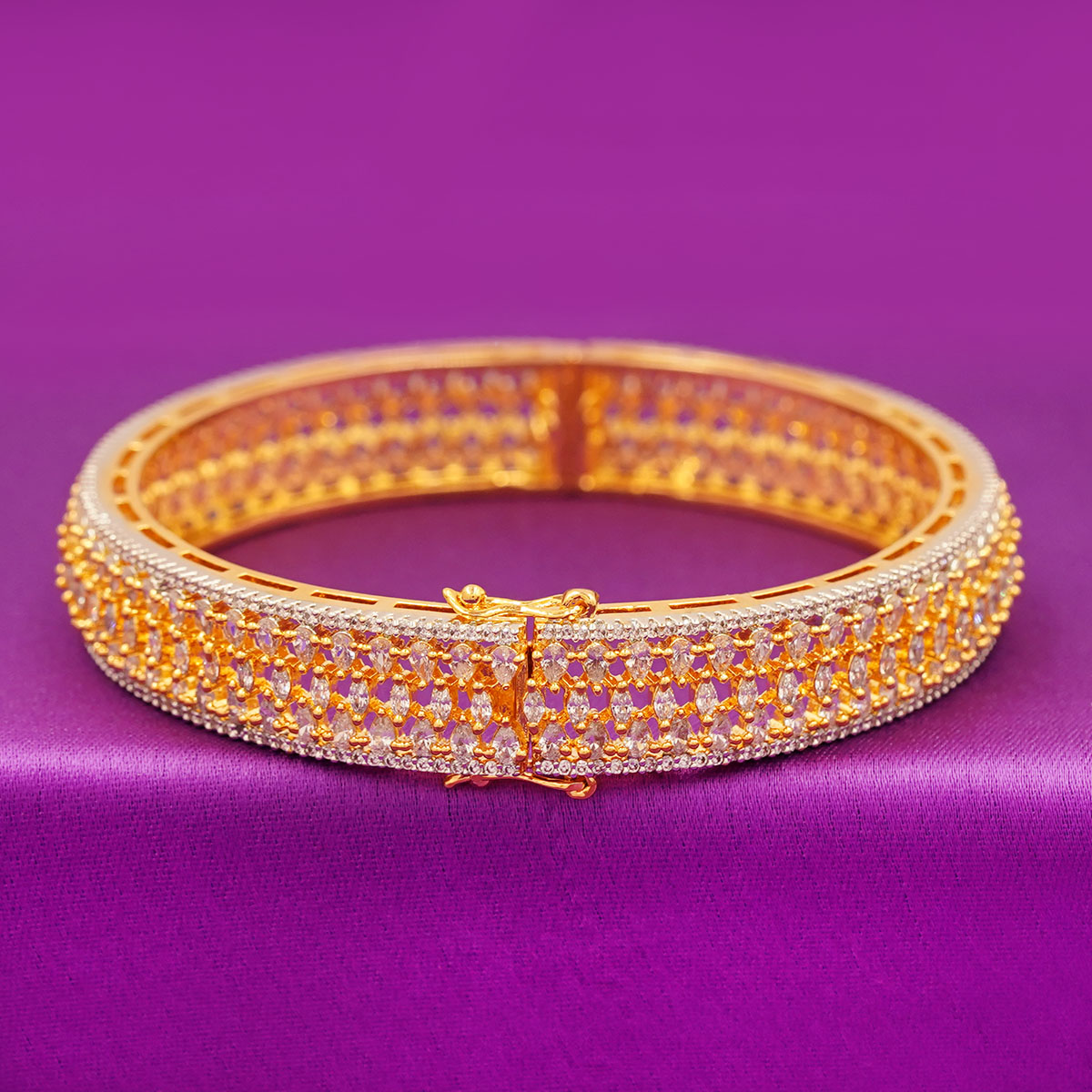 DESCRIPTION - This beautiful pair of bangles features a stylish mesh-style cutwork pattern crafted on a premium golden-finish metal base. Lightweight, comfortable, and versatile, they are ideal for weddings, parties, festive wear, and enhancing everyday traditional outfits.