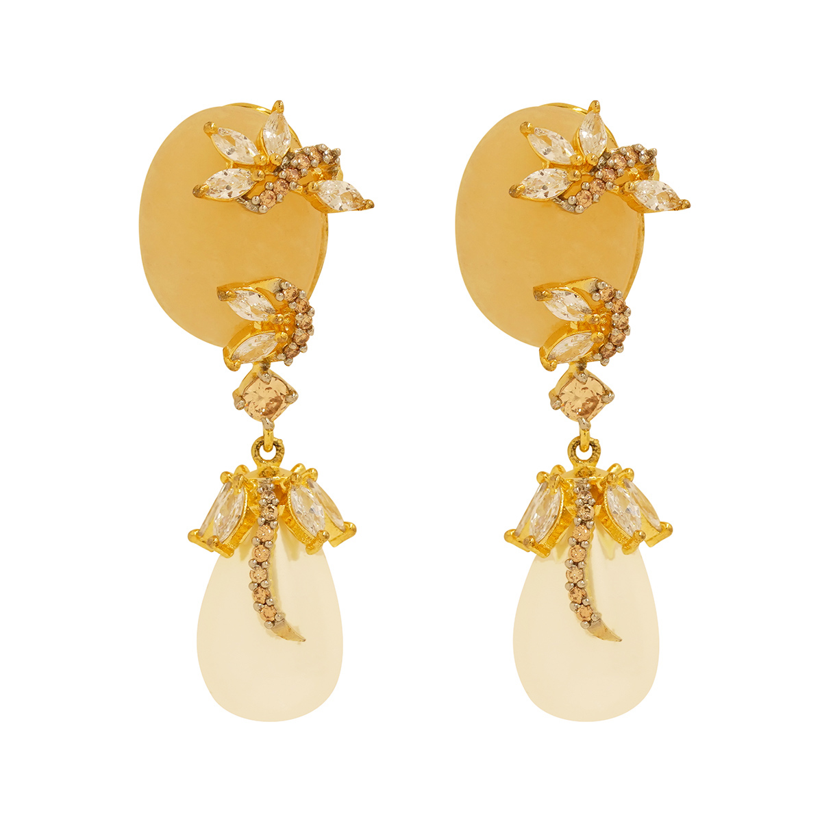 DESCRIPTION - These exquisite earrings feature a warm golden-toned gemstone paired with a lustrous pearl drop, adorned with delicate crystal-studded leaf motifs. A refined statement piece that beautifully combines elegance and charm.
