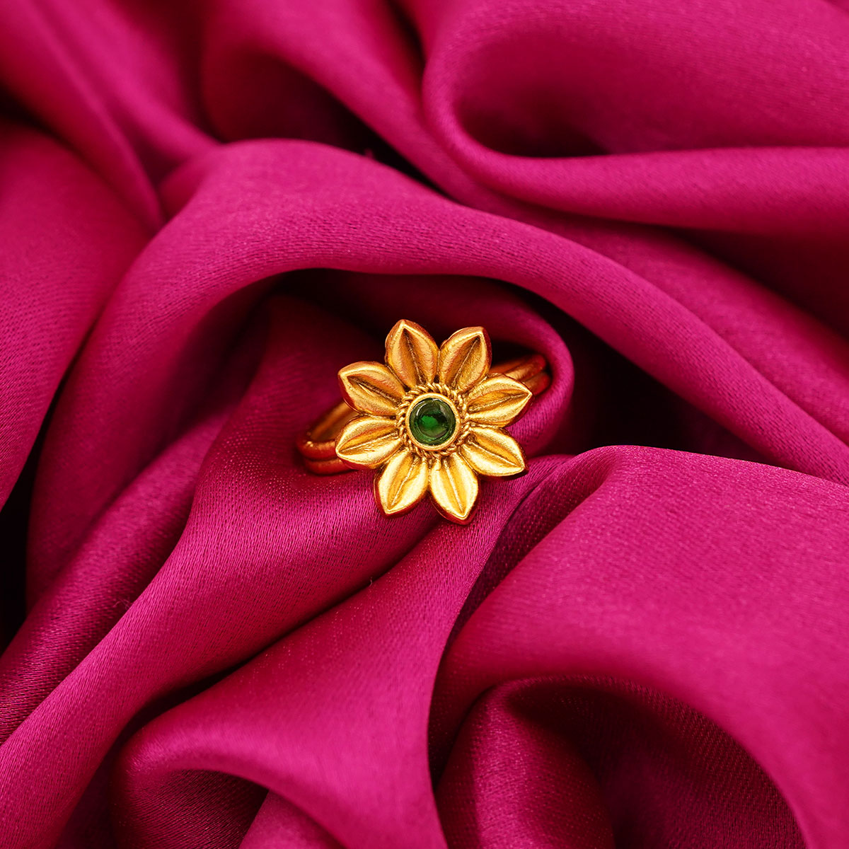 DESCRIPTION - THE GOLDEN TONE EMERALD SUNBURST RING FEATURES A VIBRANT GREEN CENTER STONE ENCIRCLED BY DELICATELY SCULPTED GOLD TONE PETALS. INSPIRED BY THE BEAUTY OF BLOOMING FLOWERS AND THE WARMTH OF SUNLIGHT, THIS RING BRINGS TOGETHER NATURE’S CHARM AND CLASSIC CRAFTSMANSHIP. ITS LUMINOUS GOLD TONE FINISH AND RICH EMERALD TONE MAKE IT A PERFECT STATEMENT PIECE FOR FESTIVE OCCASIONS, WEDDINGS, OR EVERYDAY LUXURY. DESIGNED TO CAPTURE ATTENTION WHILE REMAINING GRACEFULLY REFINED, THIS RING IS A CELEBRATION OF BEAUTY, BALANCE, AND BRILLIANCE.