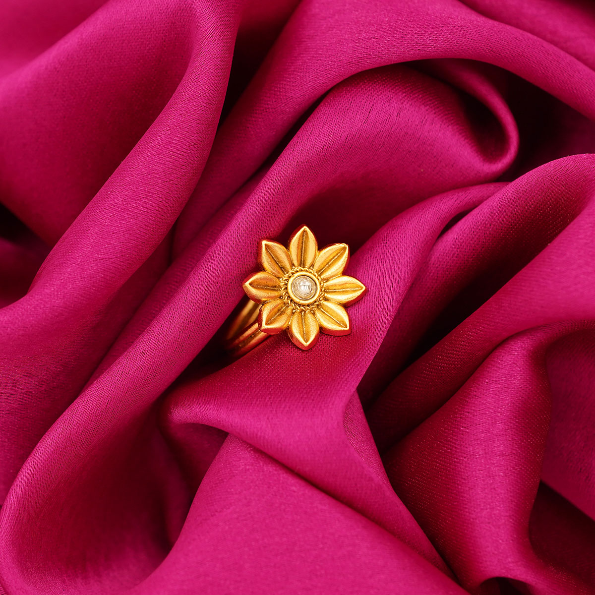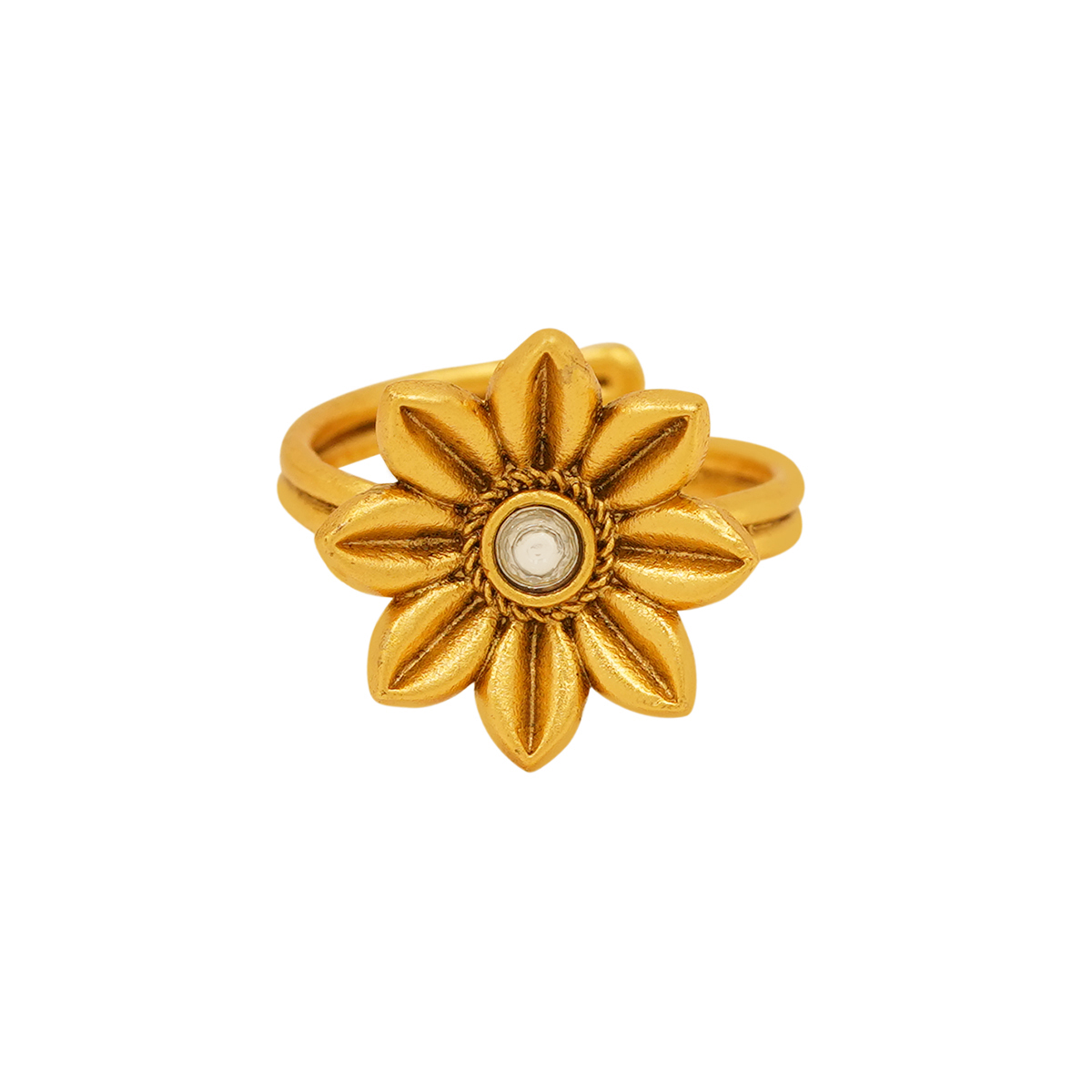 DESCRIPTION - INSPIRED BY THE BEAUTY OF A BLOOMING FLOWER, THE GOLDEN TONE RADIANCE FLORAL RING SHOWCASES DELICATELY SCULPTED PETALS IN A RICH GOLD TONE FINISH, CENTERED WITH A SUBTLE STONE FOR AN ELEGANT TOUCH OF SPARKLE. ITS GRACEFUL DESIGN BLENDS TRADITIONAL CHARM WITH MODERN SOPHISTICATION, MAKING IT PERFECT FOR FESTIVE OCCASIONS, WEDDINGS, OR EVERYDAY ELEGANCE. A TIMELESS PIECE THAT ADDS WARMTH, FEMININITY, AND REFINED BRILLIANCE TO ANY JEWELRY COLLECTION.