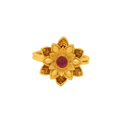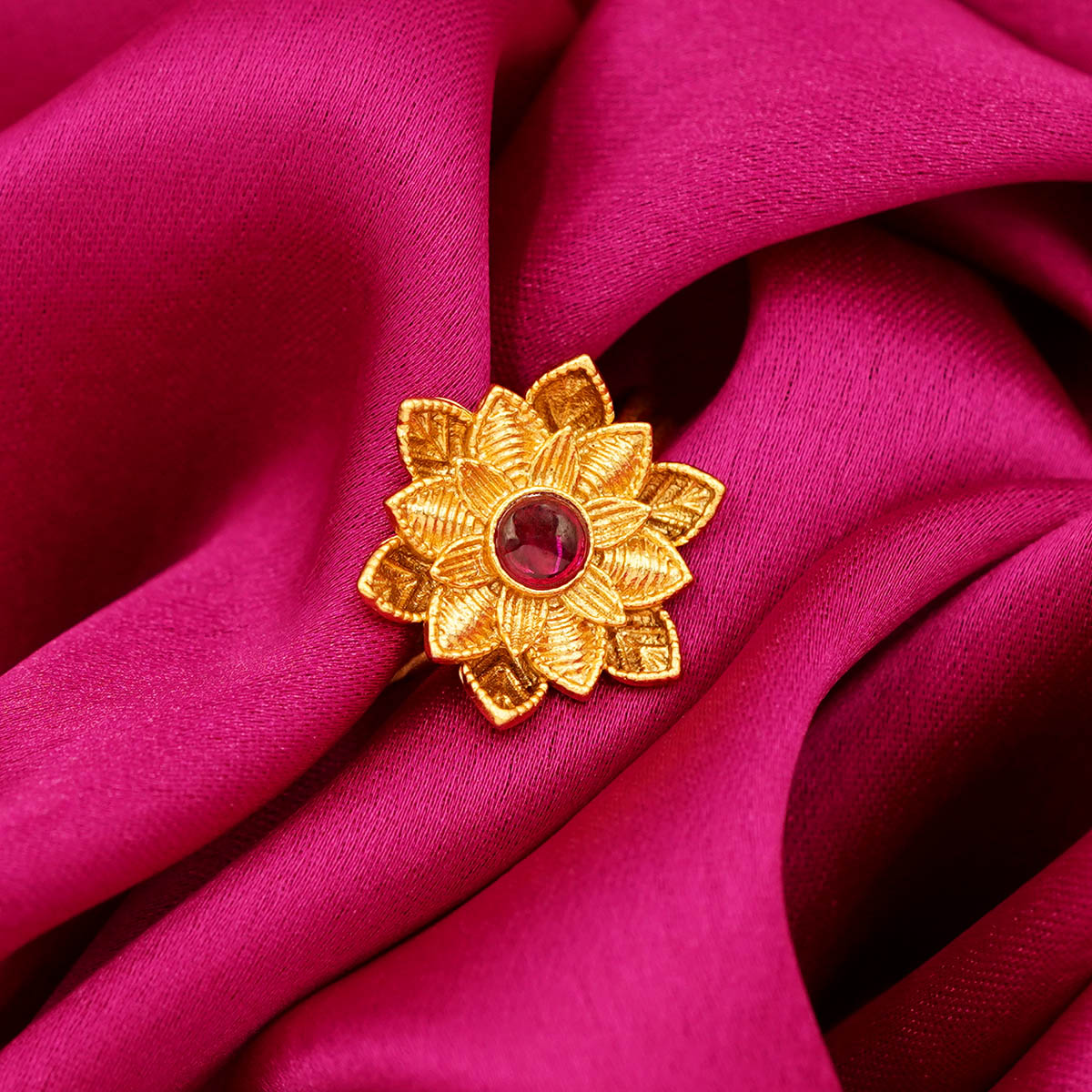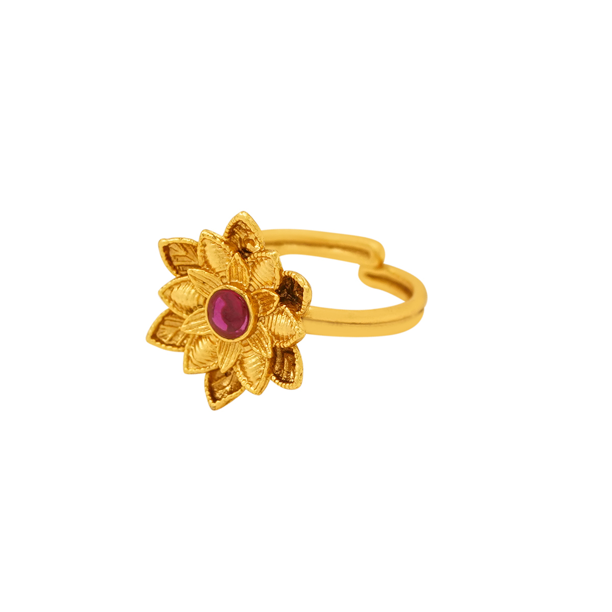 DESCRIPTION - INSPIRED BY THE TIMELESS BEAUTY OF THE LOTUS, THIS EXQUISITE GOLDEN TONE RUBY LOTUS RING RADIATES ELEGANCE AND GRACE. CRAFTED WITH INTRICATE PETAL DETAILING IN A RICH GOLD-TONE FINISH, THE DESIGN IS CENTERED WITH A DEEP RUBY-HUED STONE THAT ADDS A TOUCH OF ROYAL CHARM. THE TEXTURED PETALS CATCH THE LIGHT BEAUTIFULLY, CREATING A STRIKING BALANCE BETWEEN TRADITIONAL ARTISTRY AND MODERN SOPHISTICATION. PERFECT FOR FESTIVE OCCASIONS, WEDDINGS, OR STATEMENT STYLING, THIS RING IS A SYMBOL OF BEAUTY, PURITY, AND REFINED LUXURY.