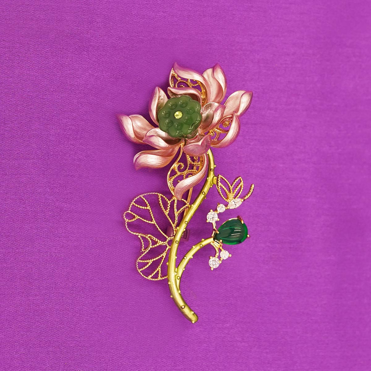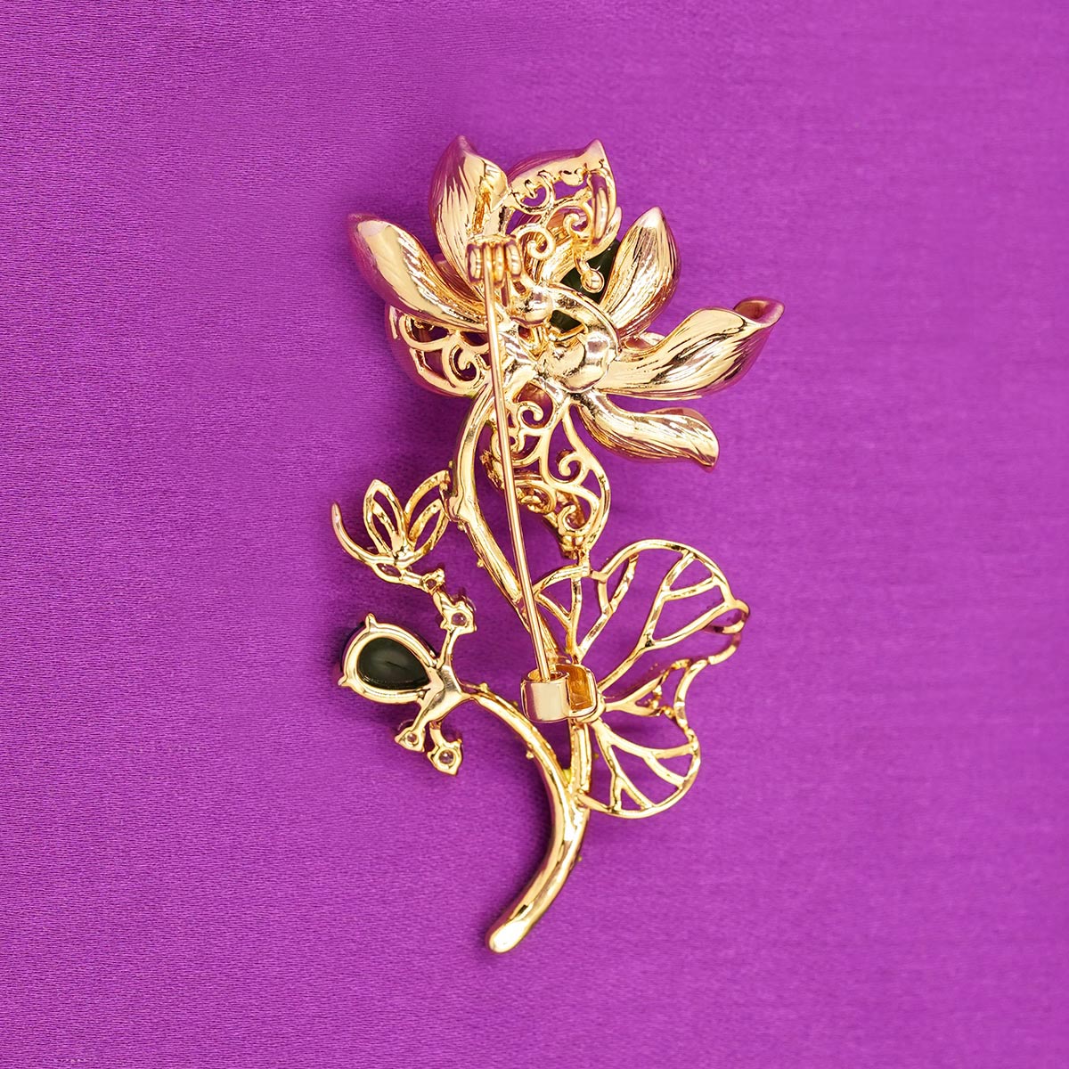 DESCRIPTION - The artistic gold-toned stem is adorned with a delicately designed lace-style leaf and a striking green teardrop stone, completing the piece with sophistication. Lightweight yet luxurious, this brooch is ideal for sarees, dupattas, shawls, blouses, gowns, and ethnic or fusion outfits. A truly graceful accessory perfect for festive wear, weddings, and premium gifting.