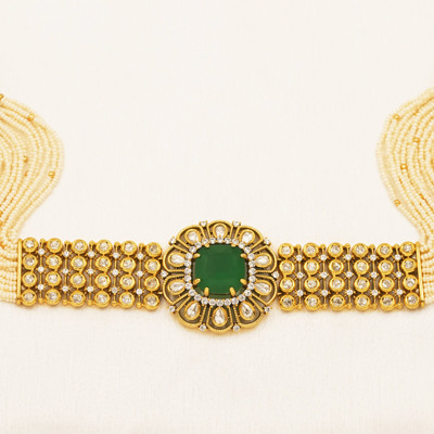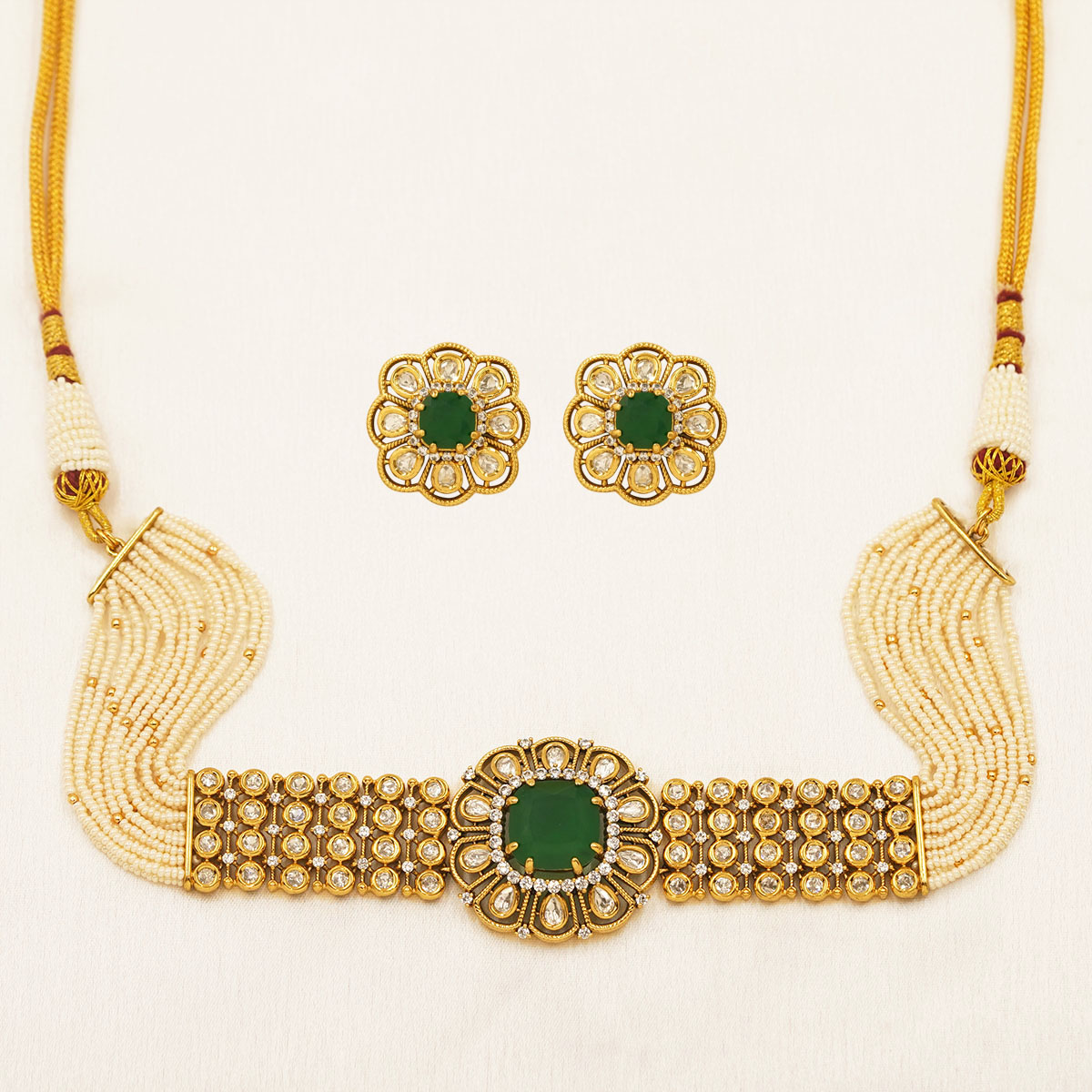 DESCRIPTION - Elevate your elegance with this regal emerald floral choker necklace set, designed to bring timeless charm to any occasion. Featuring a beautifully crafted gold-tone choker adorned with a striking green centerpiece and intricate floral accents, this set perfectly blends traditional grace with modern sophistication. Paired with matching stud earrings, it is ideal for weddings, festive celebrations, and special occasions. A statement piece that adds richness and refinement to your jewelry collection.