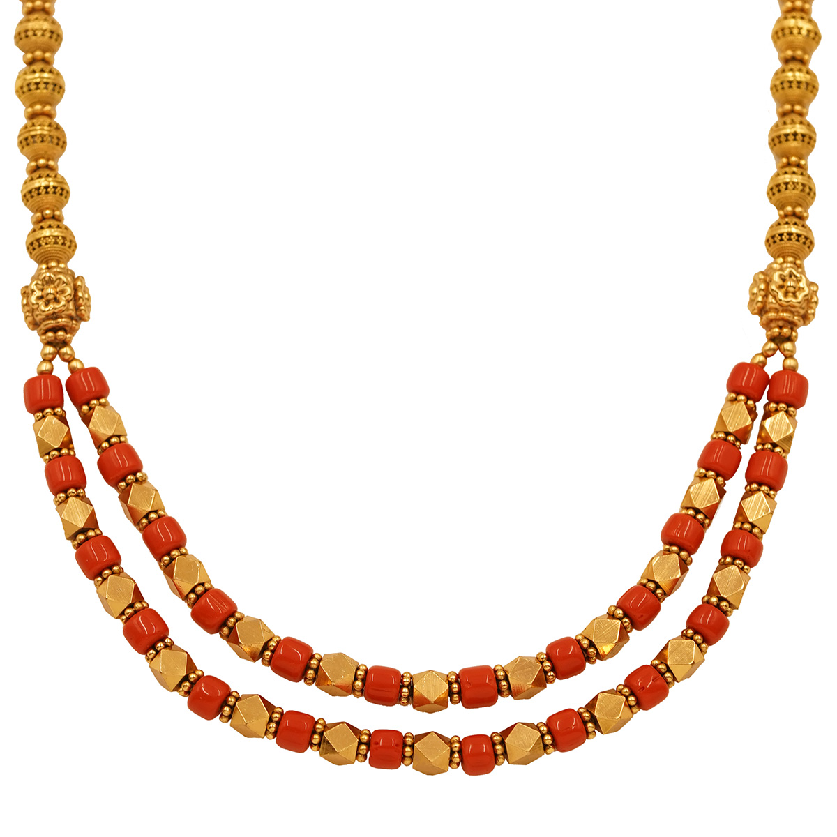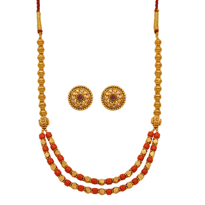 DESCRIPTION - A beautiful dual-strand necklace adorned with coral beads and intricate detailing. Lightweight, elegant, and ideal for festive outfits and everyday traditional charm.
