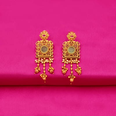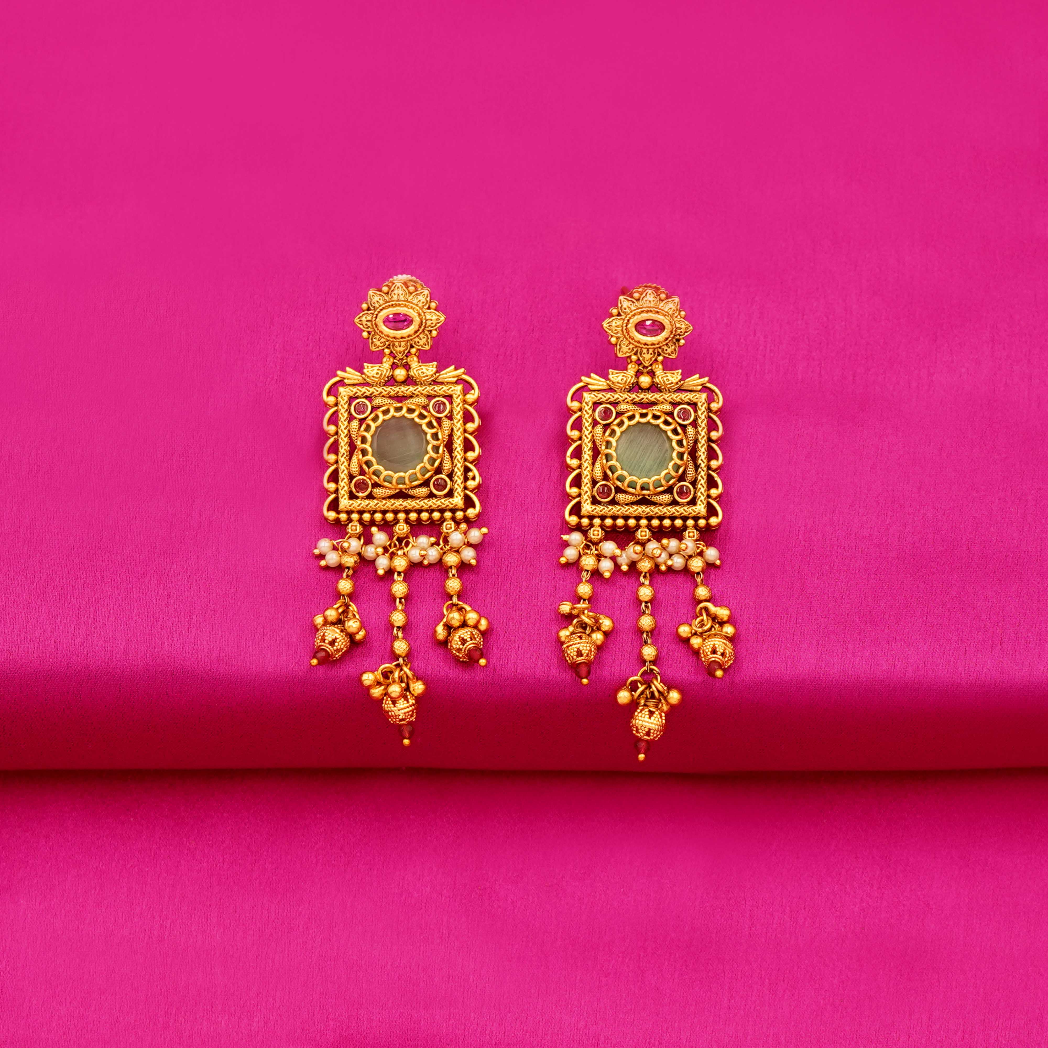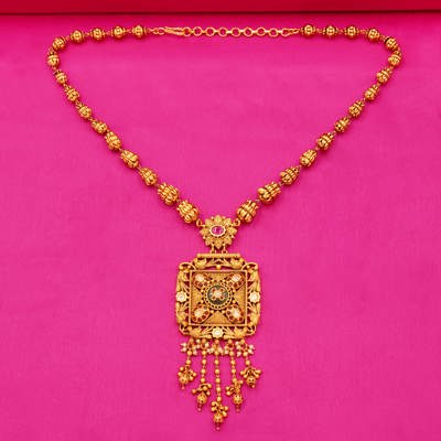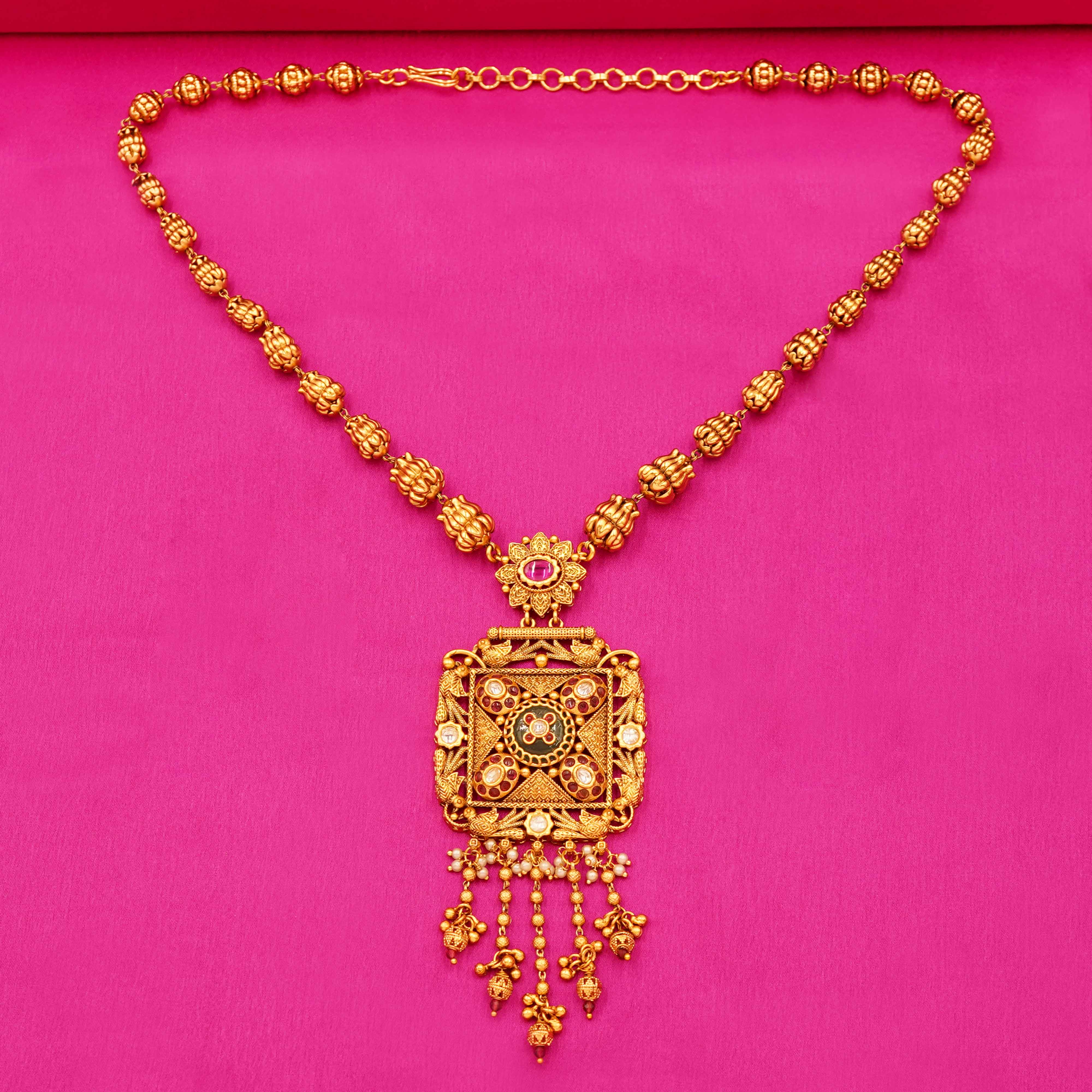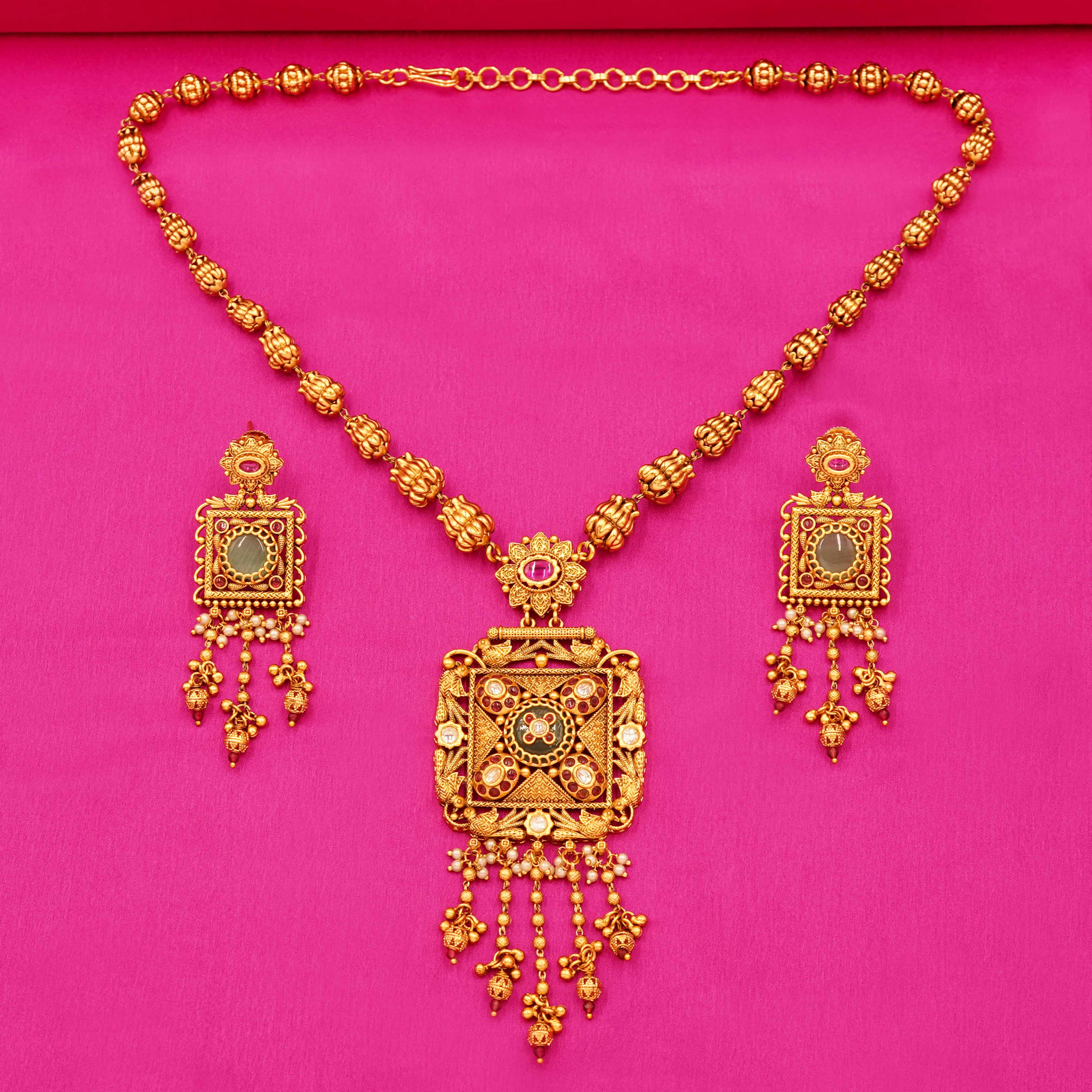 DESCRIPTION - Celebrate the grandeur of Rajasthan with this Heritage Rajwadi Square Pendant Haar. Designed with antique-style golden color beads and an intricately crafted square pendant embellished with kundan, meenakari and green stone detailing, this necklace reflects the richness of Jaipuri artistry. The long haar comes with matching statement earrings, making it a perfect pick for bridal wear, weddings, and festive occasions.
