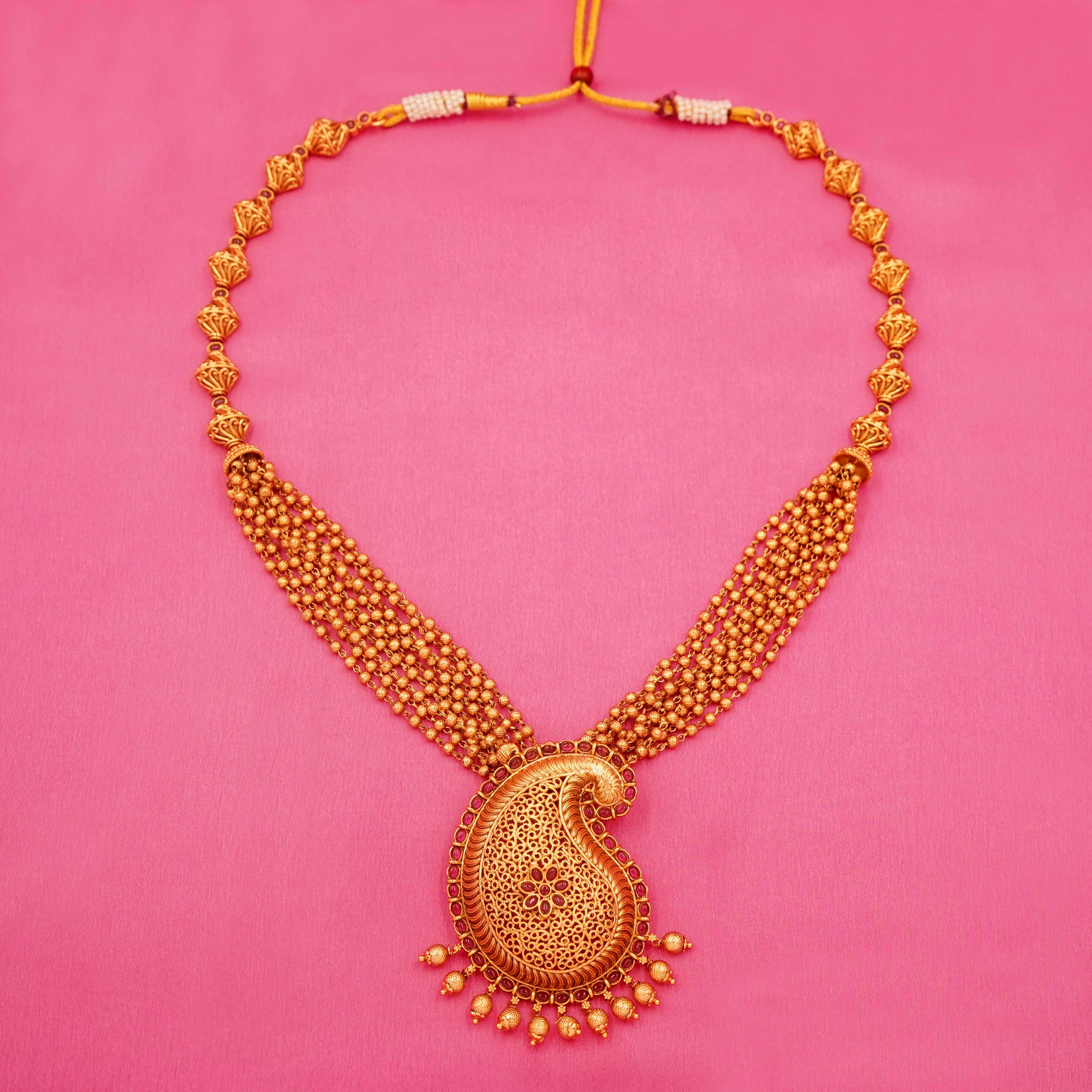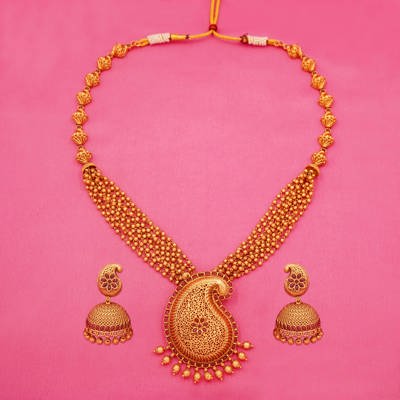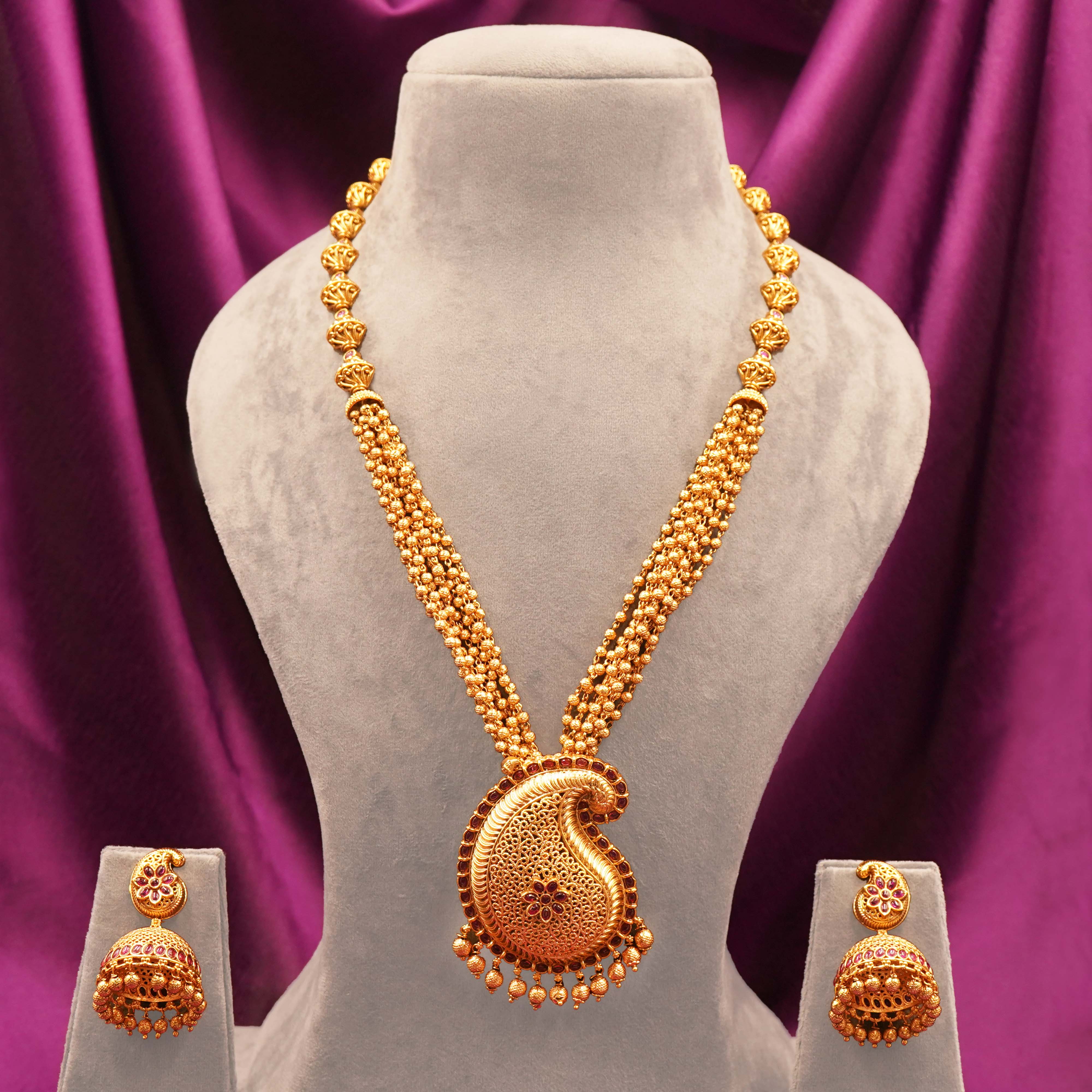 DESCRIPTION - PENDANT SET, NECKLACE WITH AN INTRICATELY DESIGNED PAISLEY-SHAPED PENDANT AND A PAIR OF MATCHING JHUMKA-STYLE EARRINGS. THE SET FEATURES DETAILED GOLD FILIGREE WORK AND IS EMBELLISHED WITH RED/PINK STONES AND SMALL PEARL-LIKE BEADS.