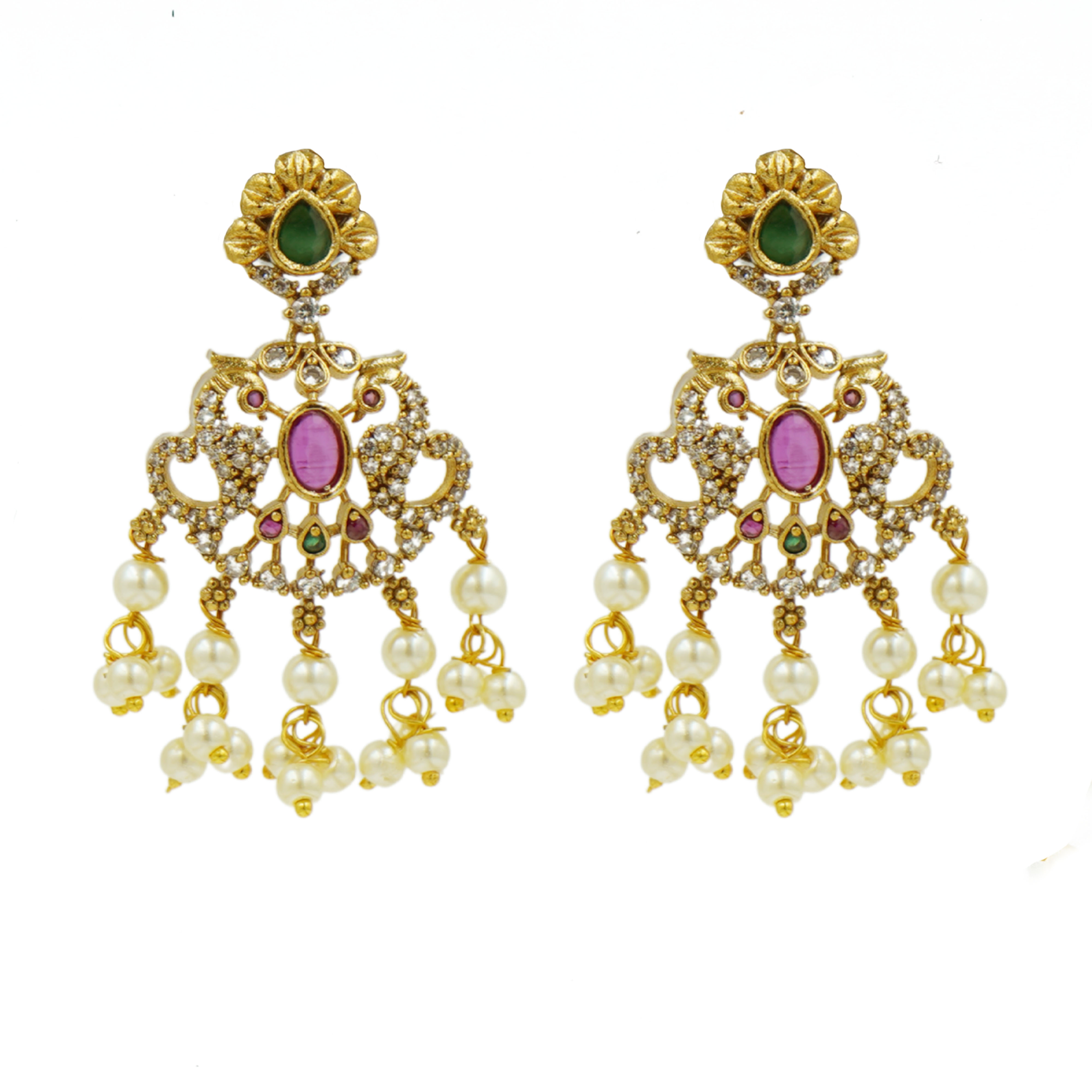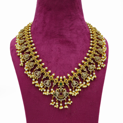 DESCRIPTION - THE NECKLACE SET FEATURES INTRICATE GOLD-TONE METALWORK ADORNED WITH PEARLS, GREEN AND RUBY-COLORED STONES, AND WHITE STONES, FORMING AN ELABORATE AND SYMMETRICAL DESIGN.