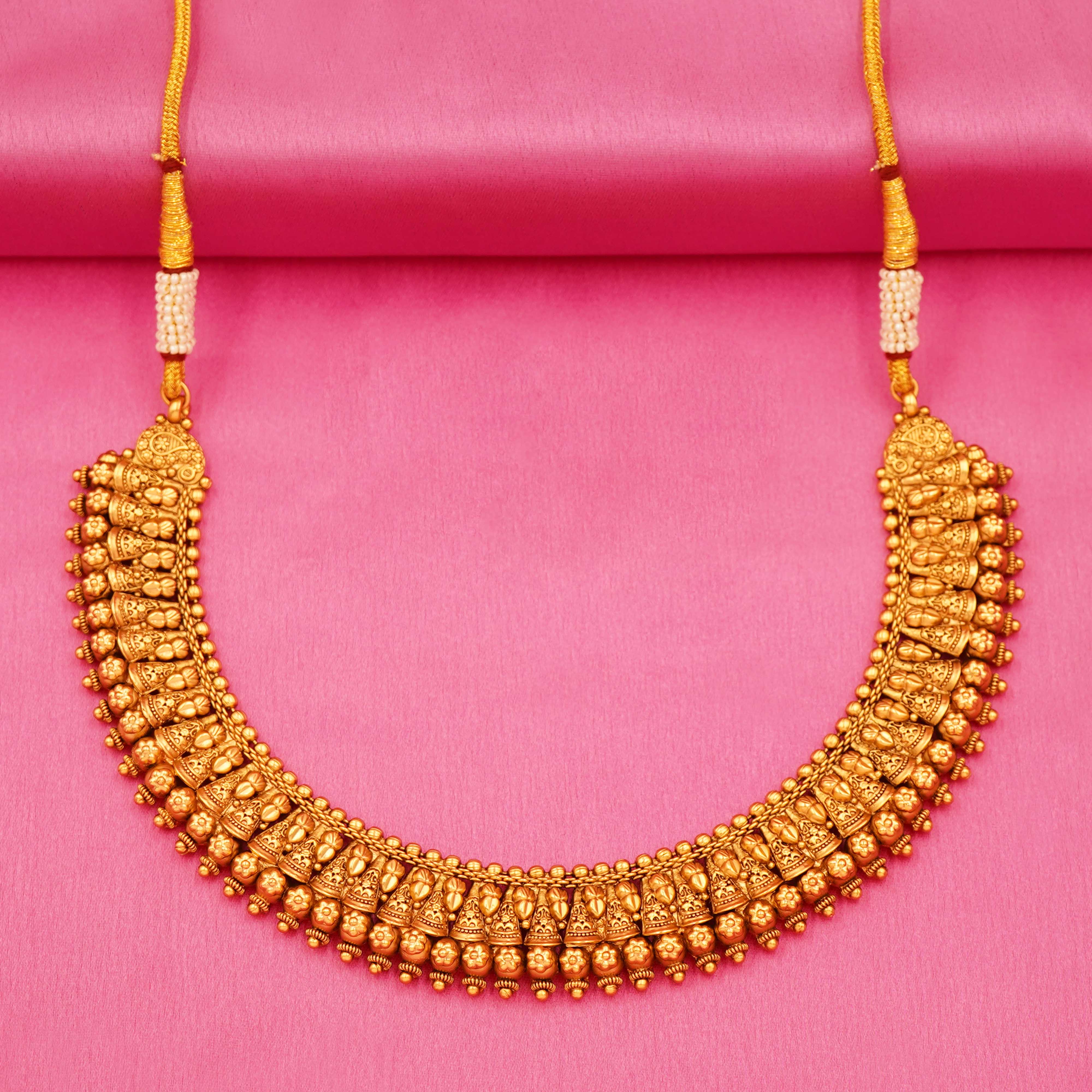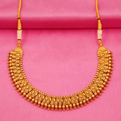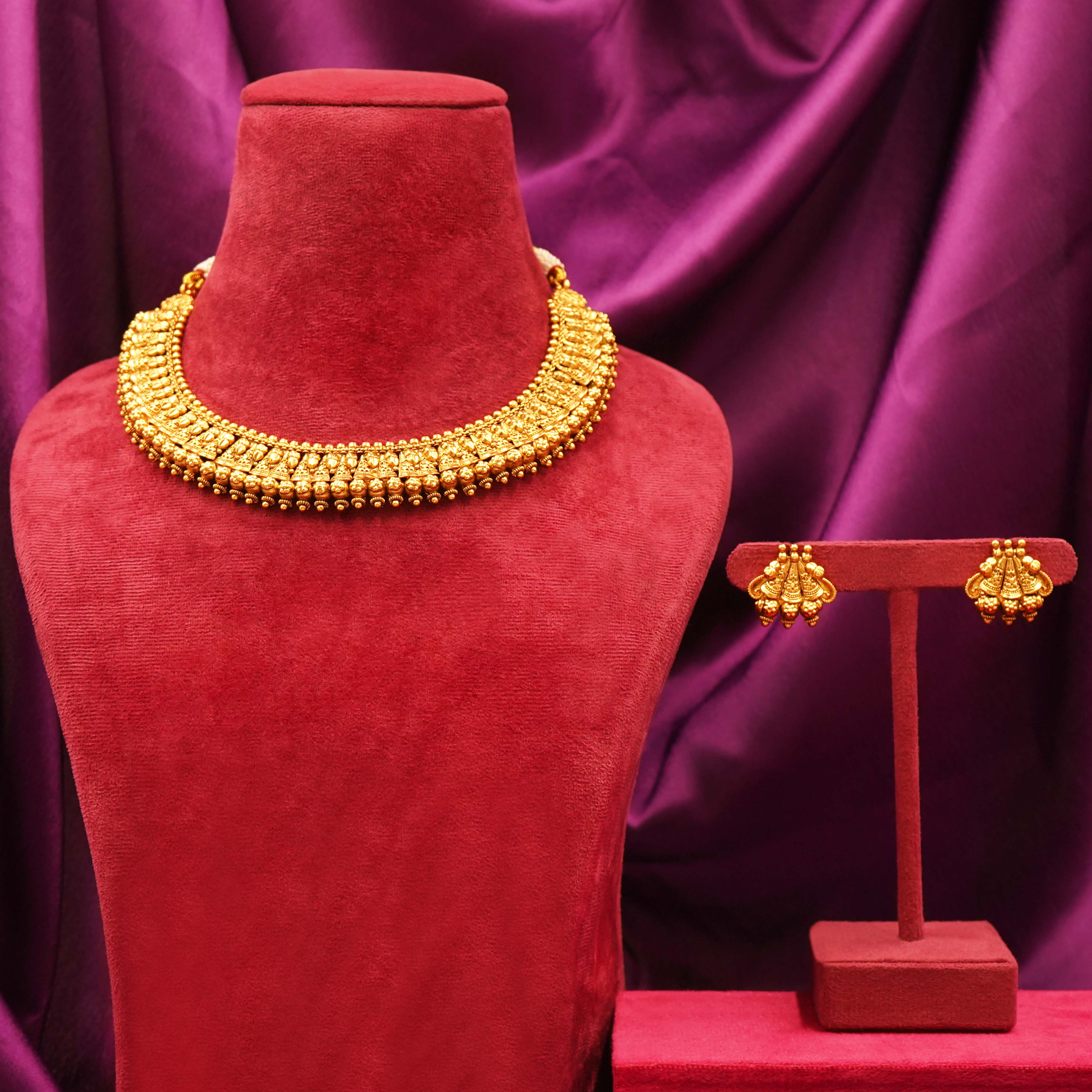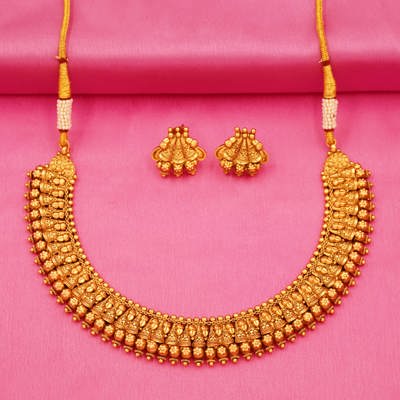 DESCRIPTION - CHOCKER SET/NECKLACE SET, A TRADITIONAL SOUTH INDIAN-STYLE GOLD NECKLACE SET, CONSISTING OF AN ORNATE CHOKER NECKLACE AND MATCHING EARRINGS. A TRADITIONAL SOUTH INDIAN-STYLE GOLD NECKLACE SET, CONSISTING OF AN ORNATE CHOKER NECKLACE AND MATCHING EARRINGS. THE DESIGN FEATURES INTRICATE TEMPLE-STYLE MOTIFS, COMMONLY SEEN IN BRIDAL AND FESTIVE JEWELRY, WITH A PATTERN OF SMALL DEITIES